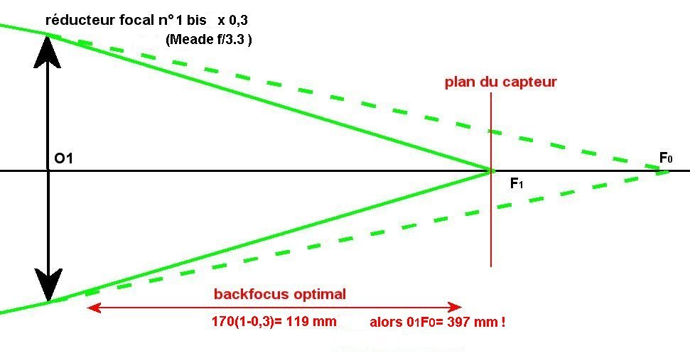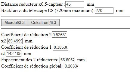 Focale des réducteurs: inconnues, pour le Meade  mes mesures m'ont amené à 180...; celle du réducteur x0,5 est de l'ordre de 105 mm