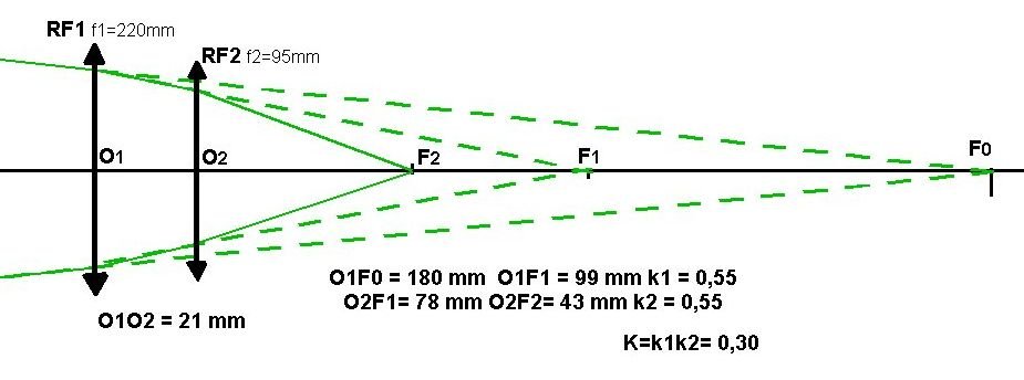 Donc, si on prend par exemple une première lentille: f1= 40 mm, d1= 30 à 40 mm alors, on cherchera une seconde lentille avec f2= 10 mm et un diamètre d2 > à 8 mm.