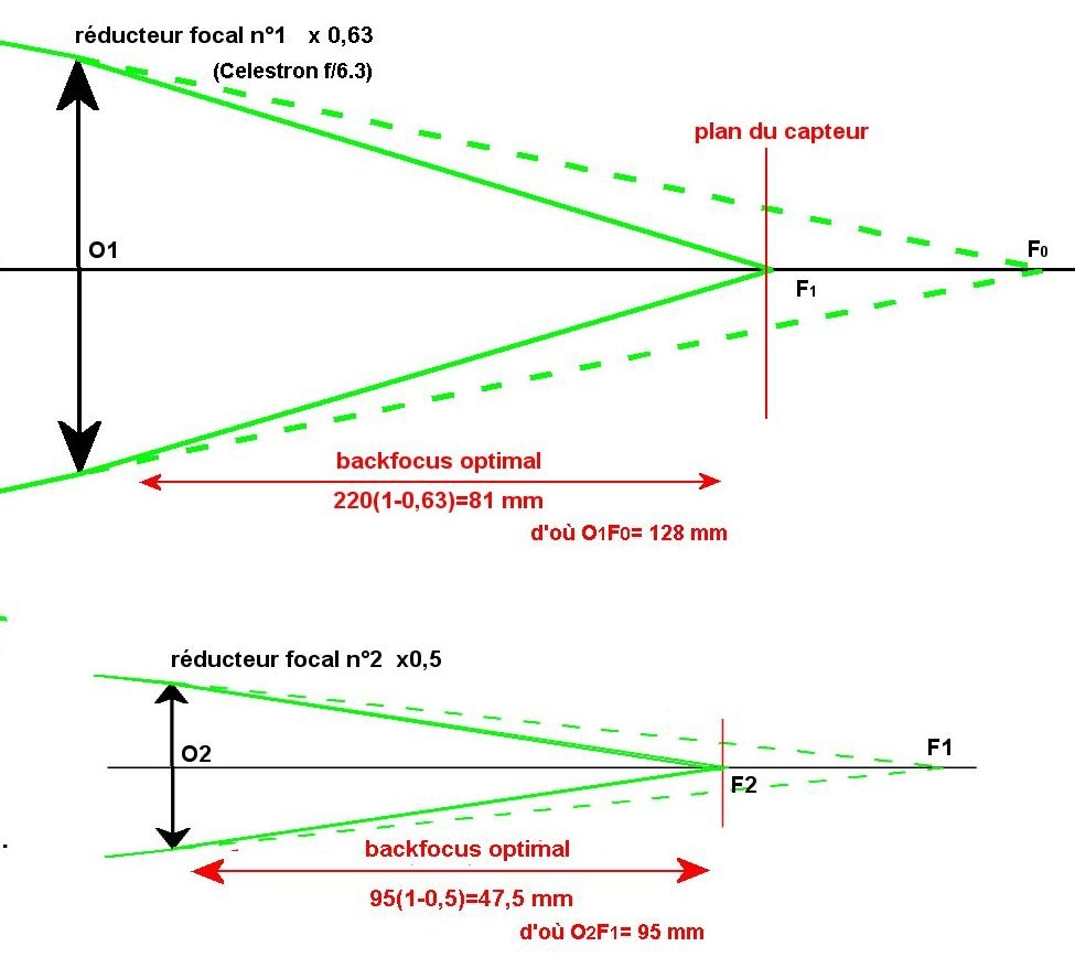 Dans le cas n°1 il faudrait donc que le foyer F0 du C8 soit à 128 mm du réducteur. Pas de problème, c'est largement dans les possibilités de mise au point.