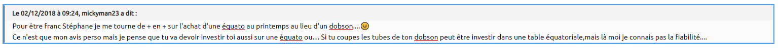 Men fout! 😊 j'ai jusqu'au printemps pour me décider car à l'emplacement du futur telescope ( un placard que j'ai construit dans mon garage) bah....ya du bois de chauffage dedans pour l'instant.... 😊