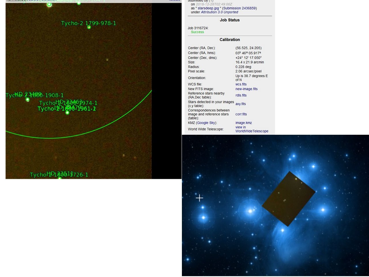Je me suis permis de passer une de tes images à Astrometry.net après avoir ajusté luminosité , contraste et gamma; çà donne déjà des infos sur le champ et l'échantillonnage.