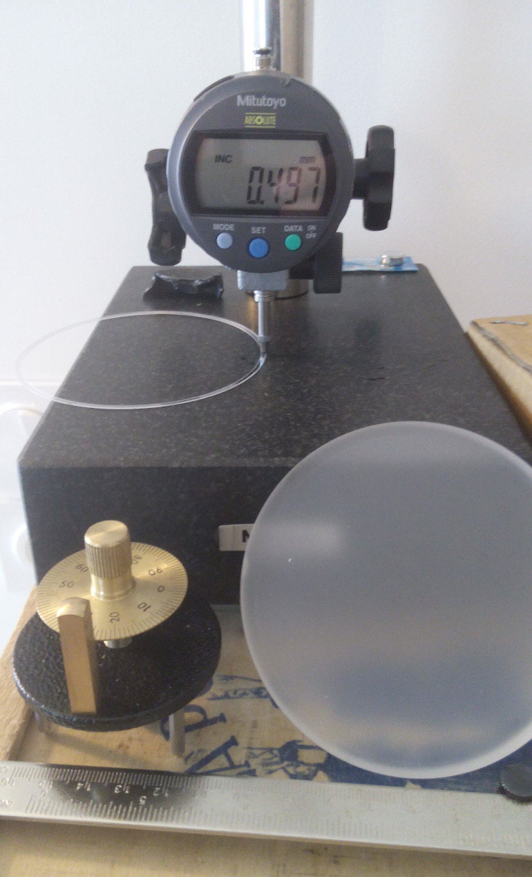 Un bon outil (marbre et comparateur) potentiellement 2 à 5 fois plus précis que le sphéromètre premier prix en bas à gauche de la photo (marbre et comparateur à 3um). En train de mesurer l'espaceur d'entrefer de la Meade FH