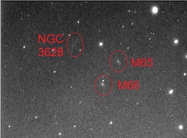 Bon, j ai profite d'une trouee nuageuse d'environ 3 a 4 minutes sur la constellation du Lion pour refaire une image du trio M65, M66, NGC3628, avec toujours le meme set up sur trepied photo/video, mais cette fois ci en refroidissant le capteur avec le module Peltier integre de la camera, et en faisant de la soustraction de dark automatique "a la volee".