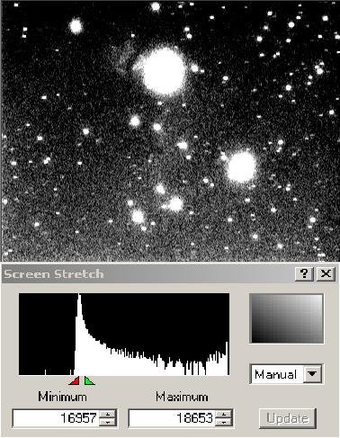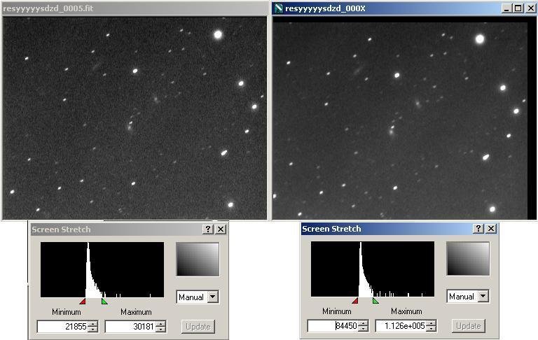 Dans l'image stackee (stack en 4X6s), on voit bien du point de vue valeur limite basse et haute de l histogramme, en essayant d'englober dans les 2 cas, de facon similaire qualitativement parlant la plus grande partie exploitable du pic, que la distribution des pixels en fonction de leur luminosite est beaucoup plus etalee que dans l'image unitaire de gauche.