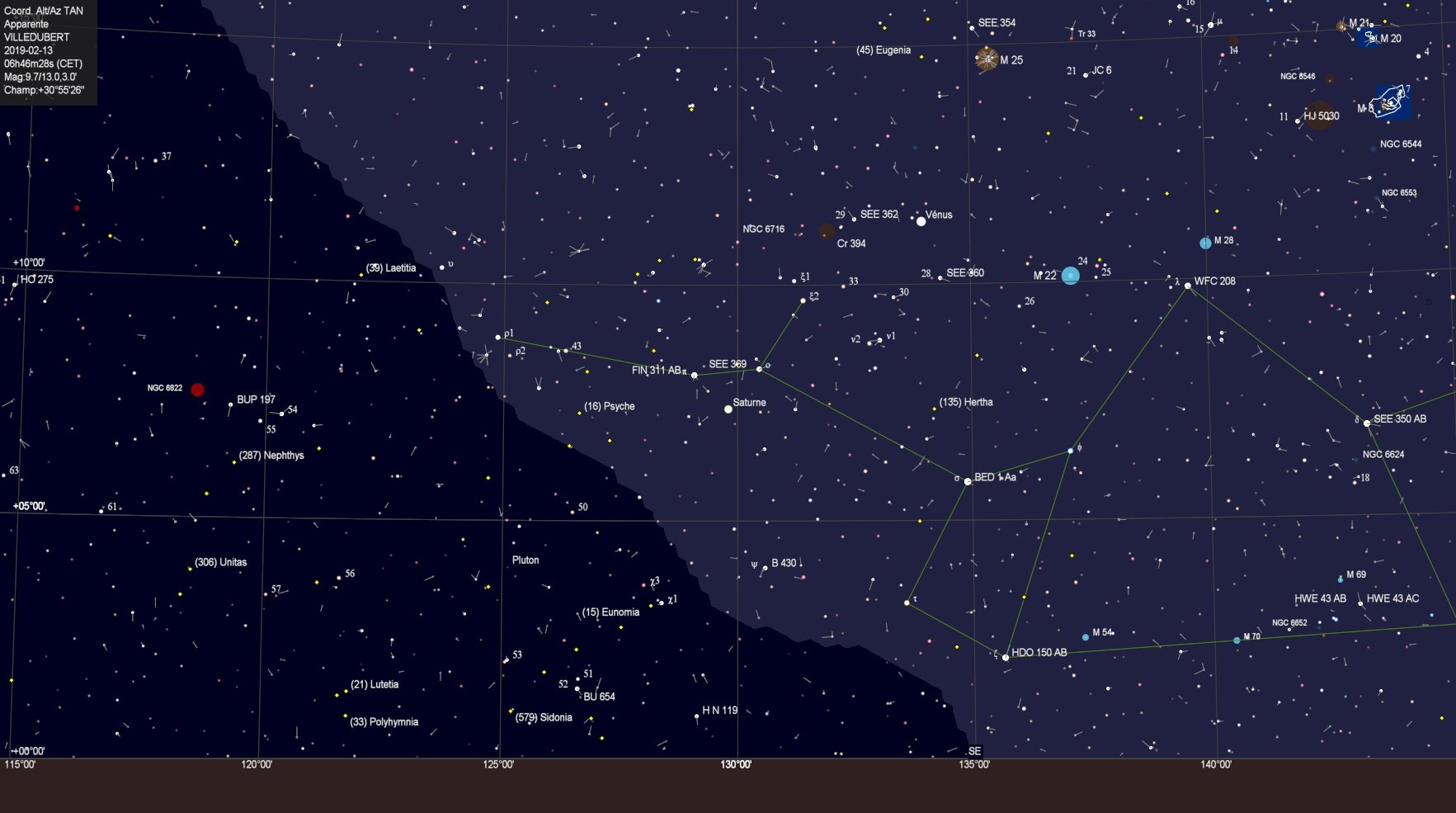 A) Pour t'aider à te repérer, voici une carte où tu reconnaîtras Saturne, au centre puis Vénus un peu plus haut. C'est la carte du ciel de ce matin, à 6 h 46. Est-ce que cela correspond à ce tu as pu observer, à l’œil nu ?