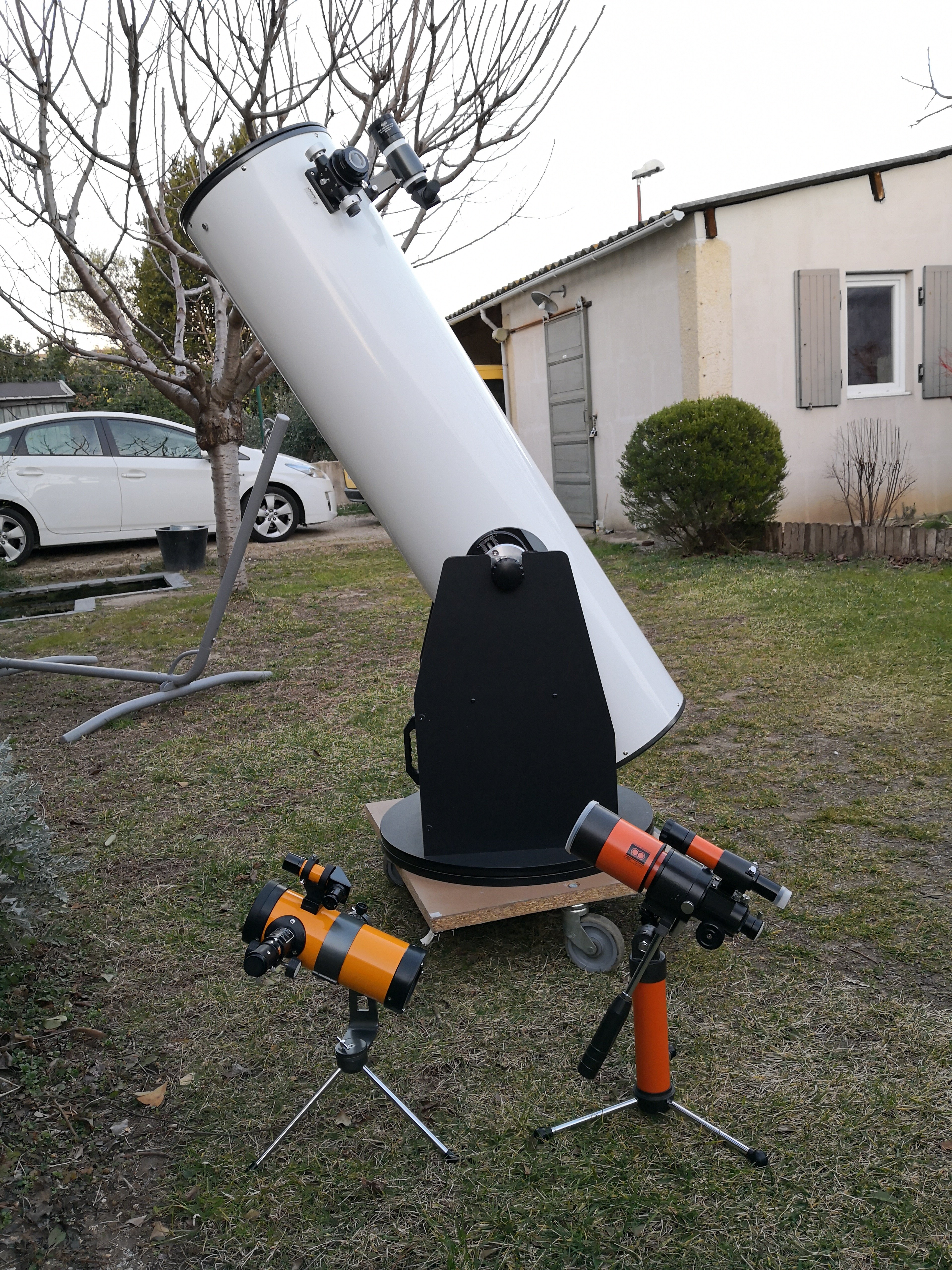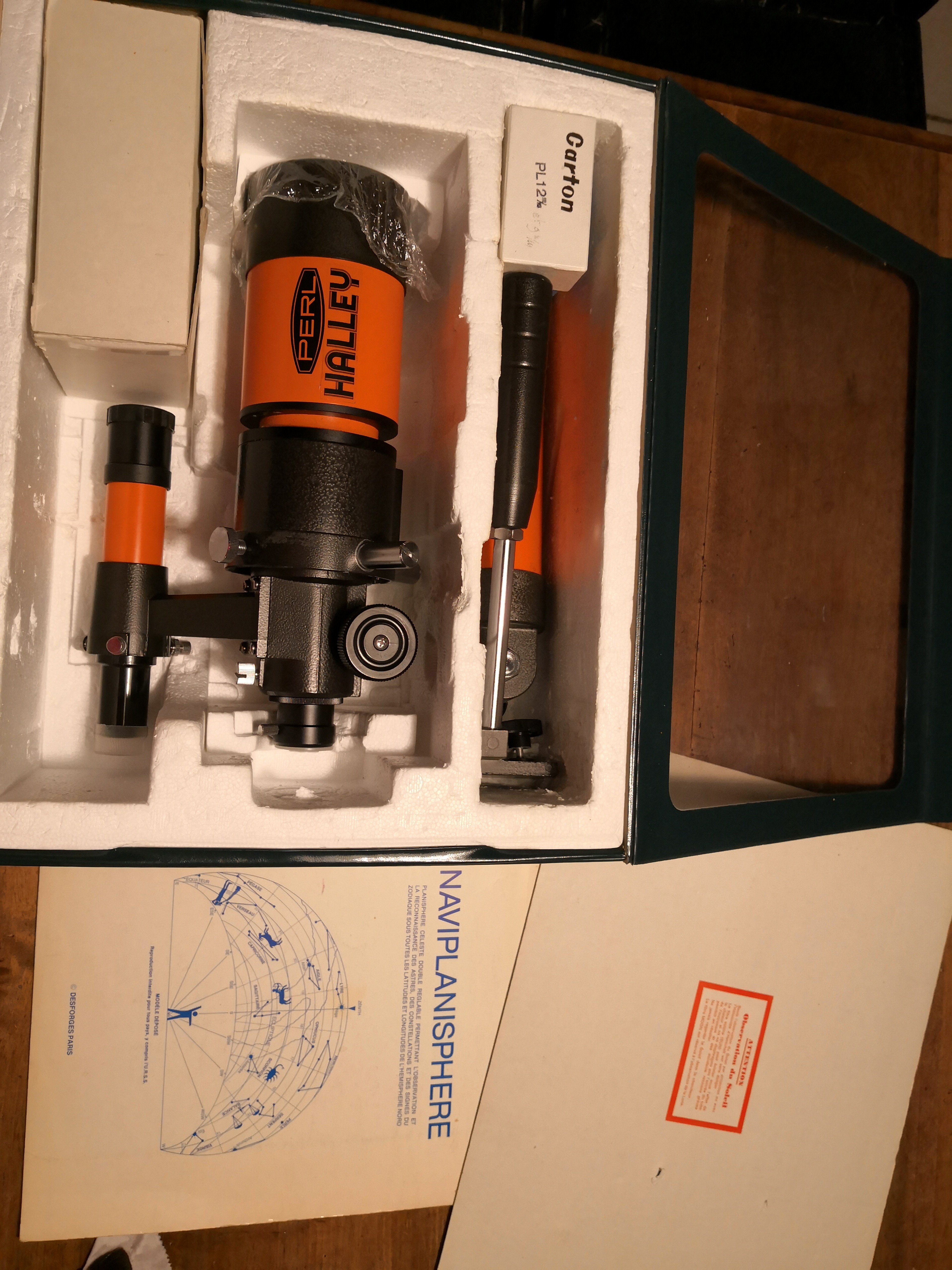 Bruno30000 Posté 15 février 2019 Posté 15 février 2019 (je reposte au bon endroit, j'avais mis ça dans "matériel général"... Désolé pour la redite pour certains d'entre vous !) Salut les amis, Ça y est je l'ai reçue !! Je vous raconte l'histoire : il y a quelques temps, je me suis pris de passion pour les instruments compacts (japonais) qui me rappellent tant mon adolescence a mater des catalogues et des revues d'astronomie... (Probablement une réaction de mon subconscient à mon premier transport de mon Kepler 300mm!) Bref, un petit Tanzutsu 76/600 est venu amorcer ma collection il y a un mois. Puis, au détour d'un site d'annonce, pourtant connu pour ses excès en terme de prix sur le matos d'astronomie, je tombe sur une annonce qui venait d'être mise en ligne : une photo pourrie, un descriptif évasif, mais un prix ridicule. Bref je craque, sans demander plus d'infos ou de photo... J'ai attendu le colis sans savoir ce qu'il allait contenir : alors voilà ! La bonne nouvelle : j'ai plein d'accessoires et d'oculaires en 24,5mm de qualité (j'ai l'impression !?), Valise d'origine, chercheur nickel, pas de rayures sur les tubes, monture impeccable. Mauvaise nouvelle, j'ai pas le cache de l'objectif, ce dernier est plein de poussière (dedans aussi car le tube n'était pas fermé !!! Arg!), ni le cache pour l'oculaire du viseur achromatique. Bref, va falloir chiner (quelqu'un aurait une idée d'où je peux trouver de l'adaptable pour l'objectif au moins ?). Voilà, je suis super content, j'ai trouvé une pépite et je suis aux anges. Vivement qu'elle retourne au charbon et qu'elle choppe de la lumière comme elle sais si bien le faire (il paraît !?). Bon je vous laisse, je vais la ranger au chaud, tout près de la valisette de son cousin Tanzutsu (qui aura droit à un post aussi car je compte redorer le blason de ces petits newton de type bird-jones, si mal aimés dans un monde qui ne reconnaît pas leur mérite et leur valeur...si si!). Bref, je me calme. Demain, j'arrête... 1