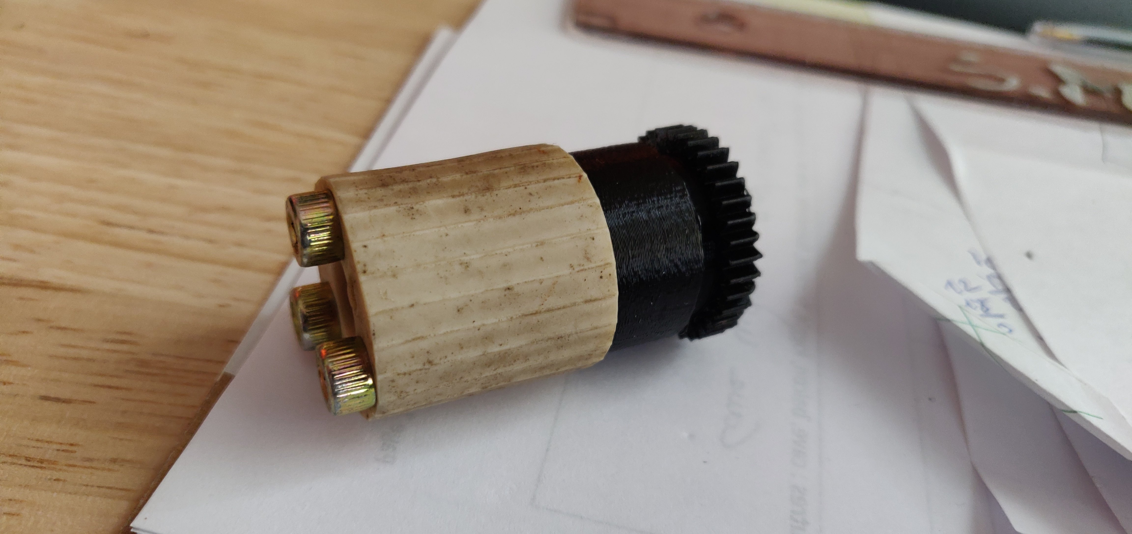 bemo Posté 31 mars 2019 Auteur Posté 31 mars 2019 petite évolution de ce sujet.... finalement on a un peu changé d'orientation, on abandonne l'idée de la crémaillère au profit d'un patin qui va frotter sous le rail courbe. Les supports cidessus vont permettre de créer un écart suffisant, environ 40mm au point bas, entre la courbe de la caisse support et du rail courbe qui porte la caisse du miroir, pour pouvoir y glisser un patin fixé directement sur le pignon du moteur. cf ci-dessous, le pignon du moteur reproduit en PLA, avec une extension sur laquelle se fixe le patin de récupération. reste à déterminer la position du moteur et le système de pression à ressort qui le maintiendra contre le rail, avec un débrayage pour permettre de retrouver un fonctionnement manuel. le pignon est le grand du moteur ci-dessous, récupéré sur une EQ6 passée en courroies. précision : les supports du post précédent seront au nombre de 4, soit 2 de chaque côté et placés plutôt vers les extrémités de la courbe du socle, dégageant donc les 40mm au centre en bas pour glisser ce patin. si intéressés je peux publier les modèles fusion et stl dans thingiverse, mais à ce stade nous sommes en phase de création... donc rien n'est encore sûr ... tout peut changer....