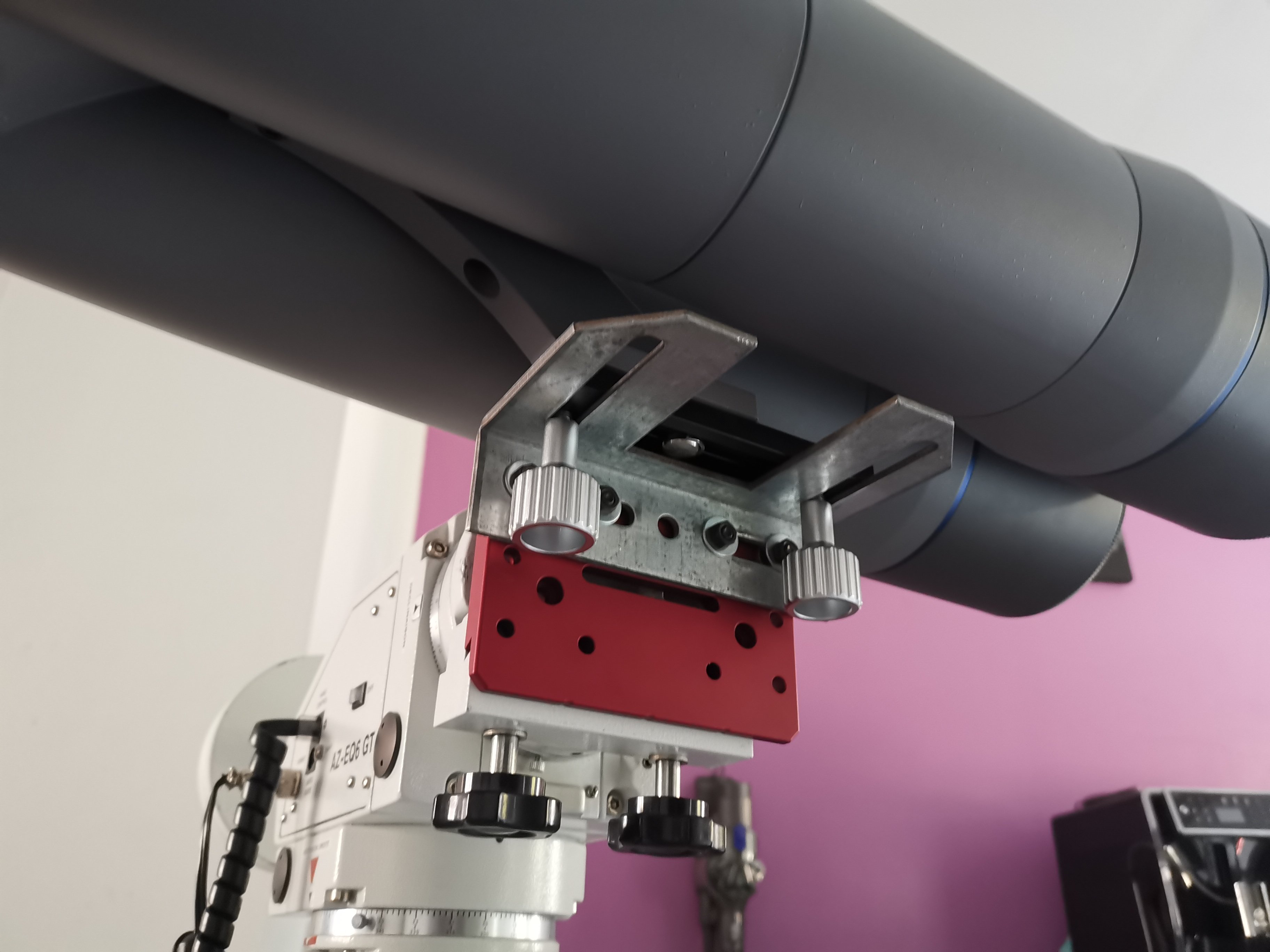 En AZ, en déclinaison c'est pas évident du tout vu que le centre de gravité est en dessus de l'axe. Ça va être au feeling. J'ai avancé l'équerre et la queue losmandy au max vers l'avant pour contrer le poids des oculaires et l'effet de poids arrière du à l'inclinaison lors de l'observation.