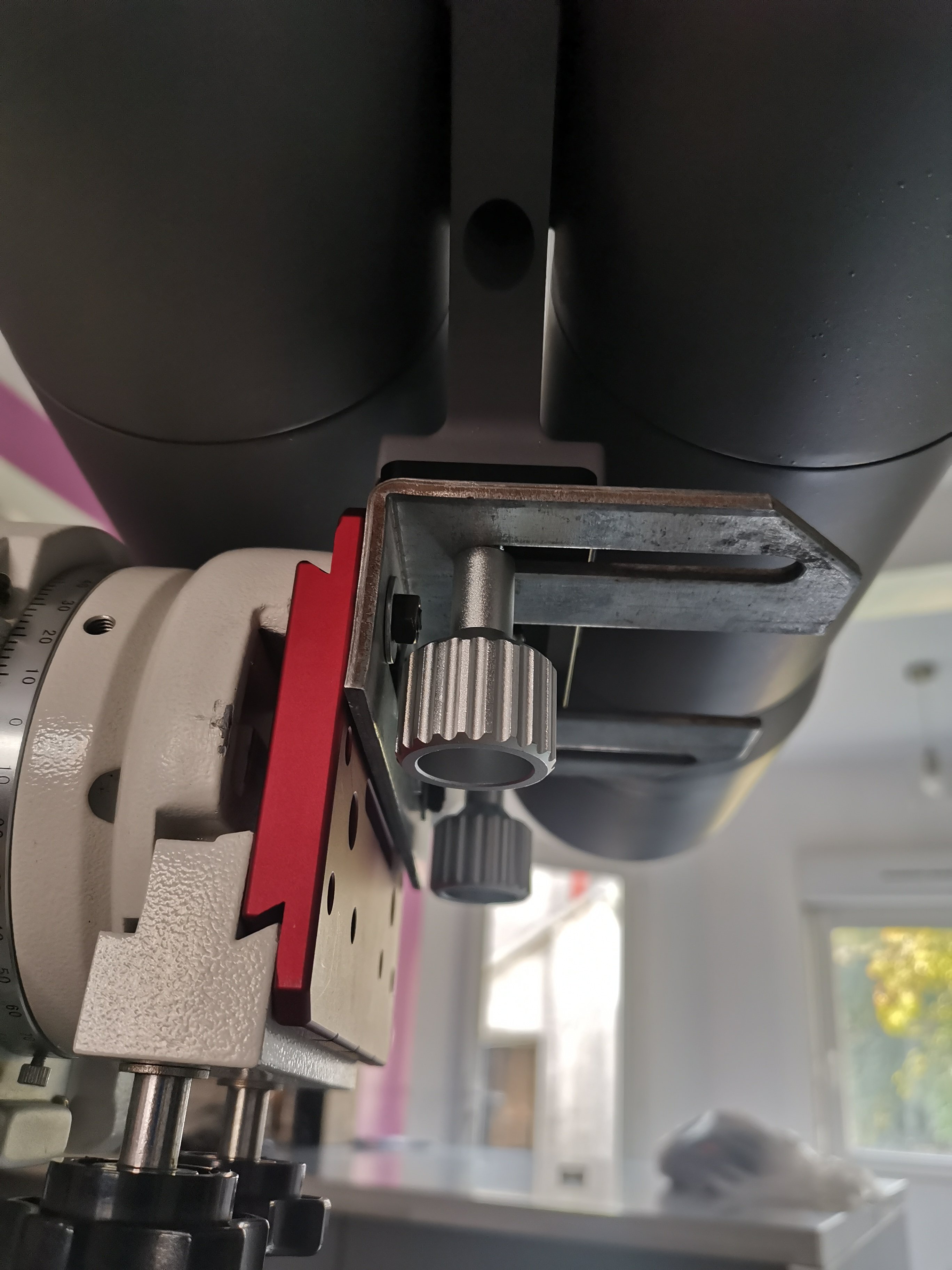 Je vais réfléchir pour bricoler une équerre, un côté qui viendra s'apposer sur la partie basse de la platine Losmandy, et l'autre qui partira de façon perpendiculaire aux jumelles, vers le sol. Au bout de celle ci, viendra un, voir deux contrepoids de mon Dobson ES (500g pièces).