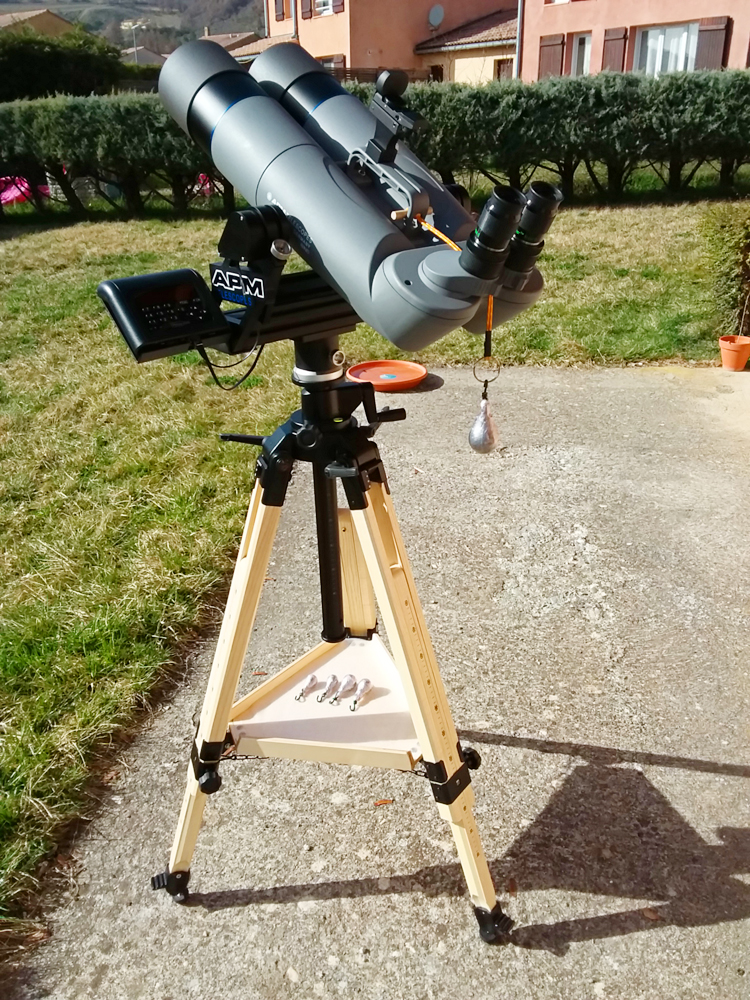 Avec mes jumelles APM 100 SD 90°, je les ai équilibrées en position à 45° environ avec une paire d'oculaires APM UFF 24 mm. Si je vise plus près de l'horizon, les jumelles vont basculer vers le bas et si je pointe plus haut que 45°, elles vont basculer vers le haut. Cela oblige à serrer davantage les freins sur l'axe de hauteur de ma monture à fourche et je n'aime pas cela.