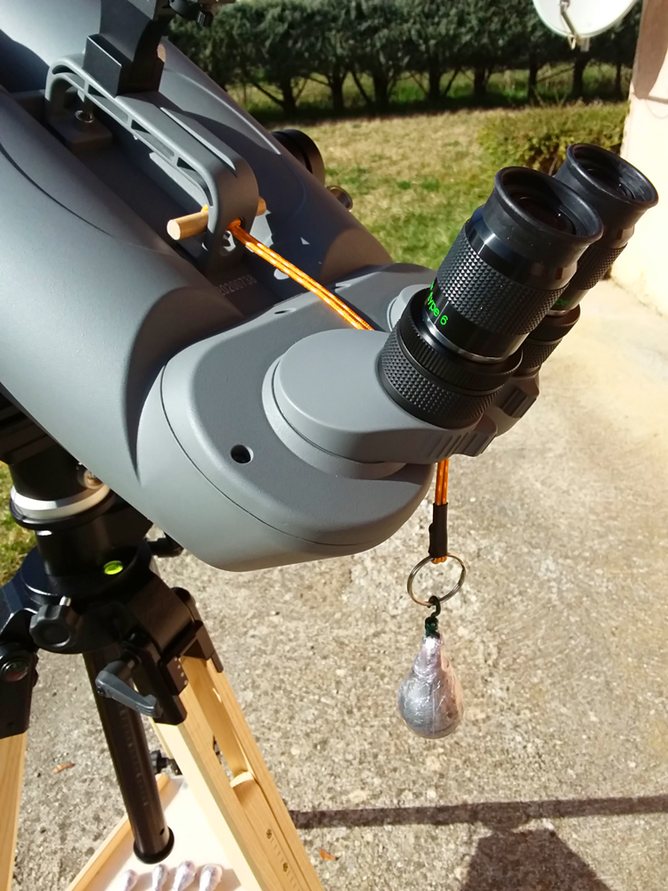 J'ai trouvé une solution toute simple et rapide pour obtenir un équilibrage des jumelles, freins desserrés, quelques soient les oculaires utilisés et quelque soit l'inclinaison des jumelles. Cette solution permet de conserver des mouvements très fluides sur l'axe de hauteur puisque les freins restent desserrés.