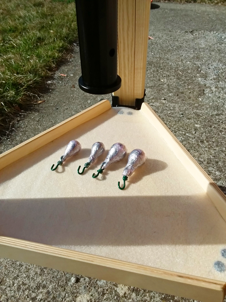 Pour les poids utilisés, ce sont des plombs de pêche en mer en forme de poire. Ils offrent du poids sous un faible volume. Je les ai équipés d'un crochet pour pouvoir les suspendre. Je les ai emballés dans du film alimentaire pour ne pas avoir à manipuler du plomb (toxique).