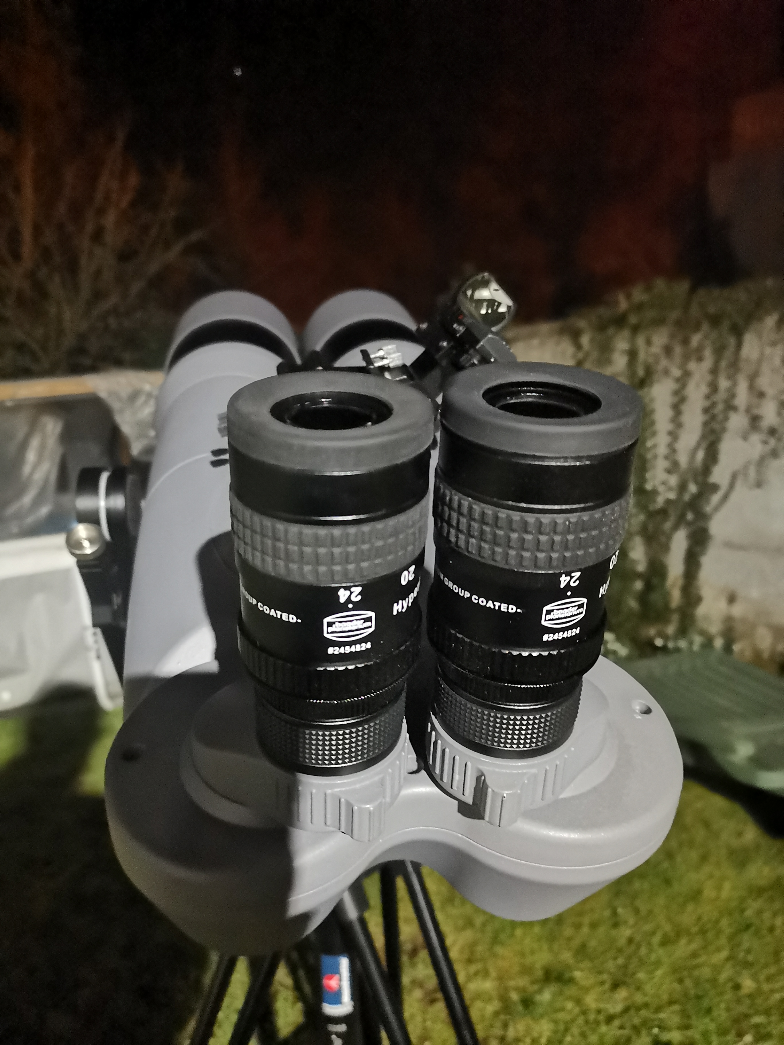 Si je change d'oculaires et par conséquent avec des poids différents, l'équilibrage n'est plus bon. J'utilises des oculaire APM UFF 24 mm, des APM UFF 10 mm et des Nagler 5 mm et 3.5 mm. Entre la paire de 24 mm (les plus lourds) et la paire de 10 mm (les plus légers), il y a 580g de différence de poids.