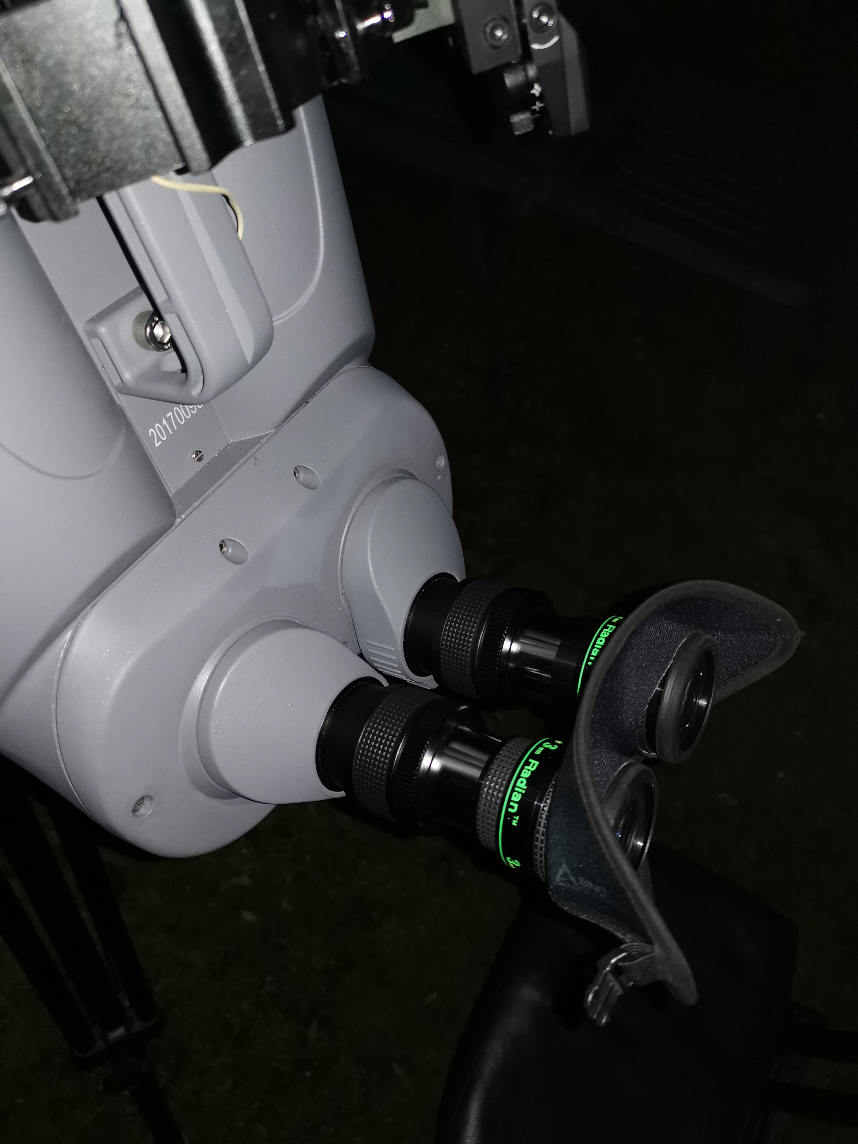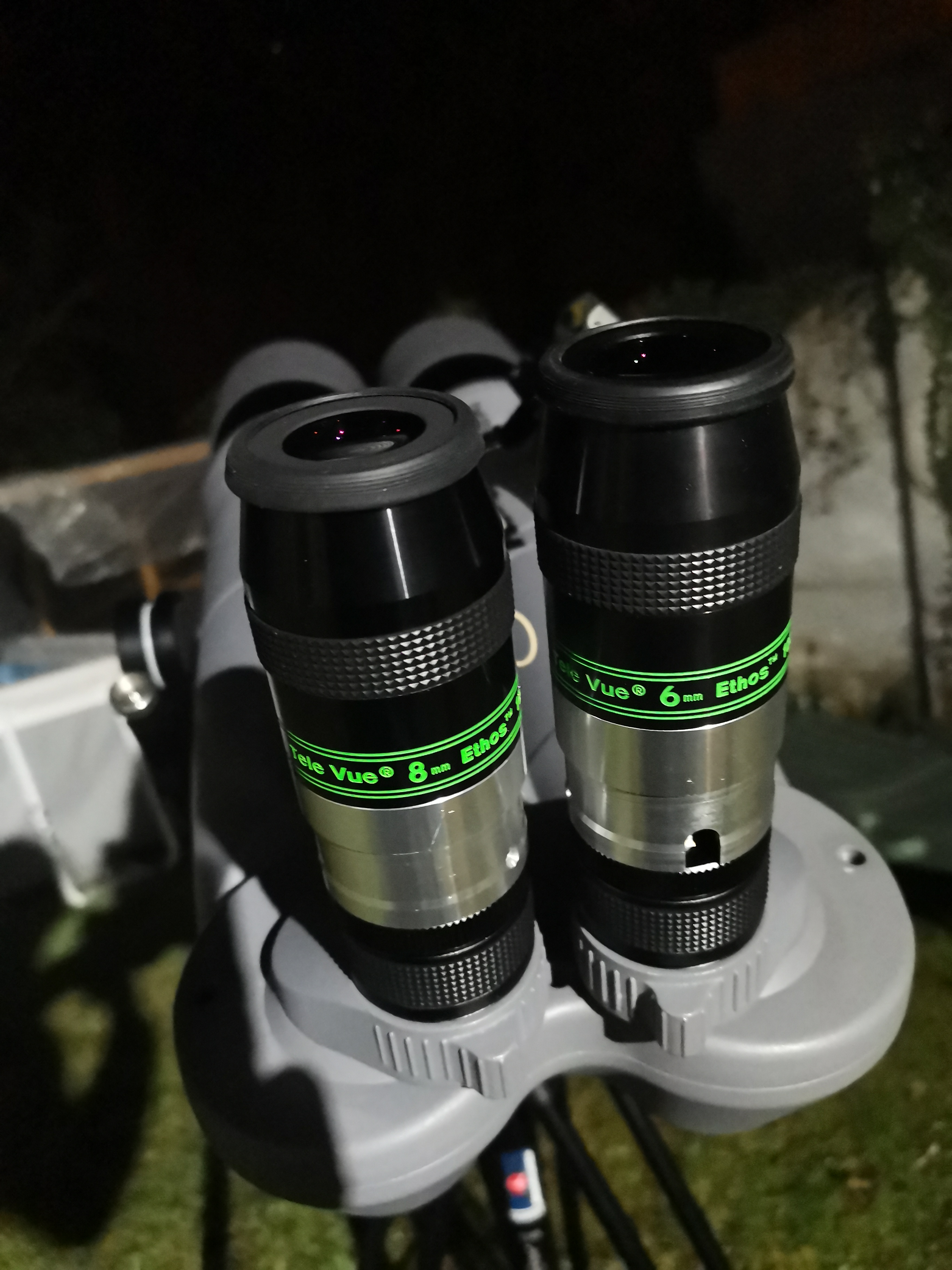 Finalement après deux bonnes heures d'utilisation à jongler entre les Vixen SSW 3.5 et les Ethos 3.7 , ces derniers plaisent beaucoup. Je dois reculer un poil afin de juste frôler les oculaires , je n'ai pas les 100° donc, mais je dois ne pas en être loin. Le gain de champ est tout de même notable, car en ayant essayé les Vixen SSW5 je me retrouvais avec quasiment le même champ ! La sensation d'immersion est excellente. La même sensation qu'en mono quand je passe d'un champ de 82° à 100°.