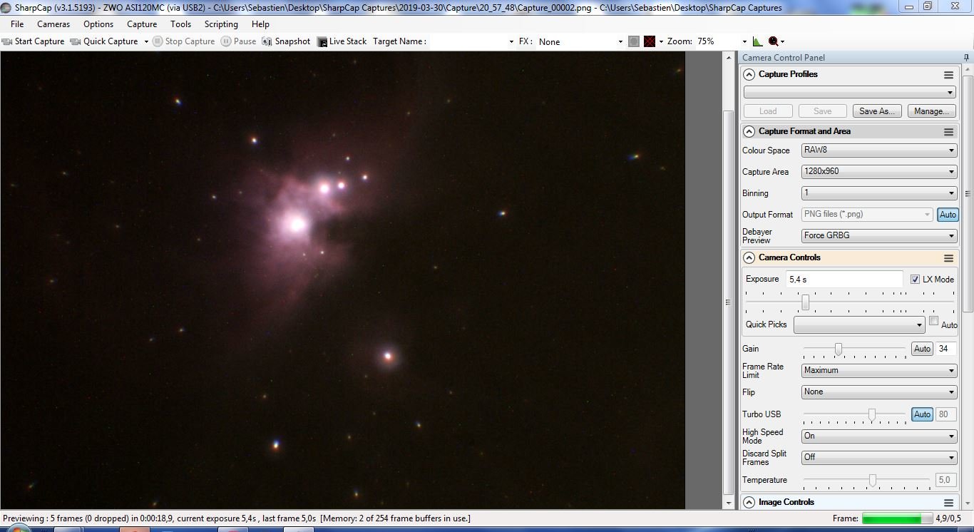 donc voici mes photos moches de M42 et M3 faites hier soir et mes grands malheurs avec Sharcap , setup "habituel" (parce que avant de claquer peut être 1000 € da