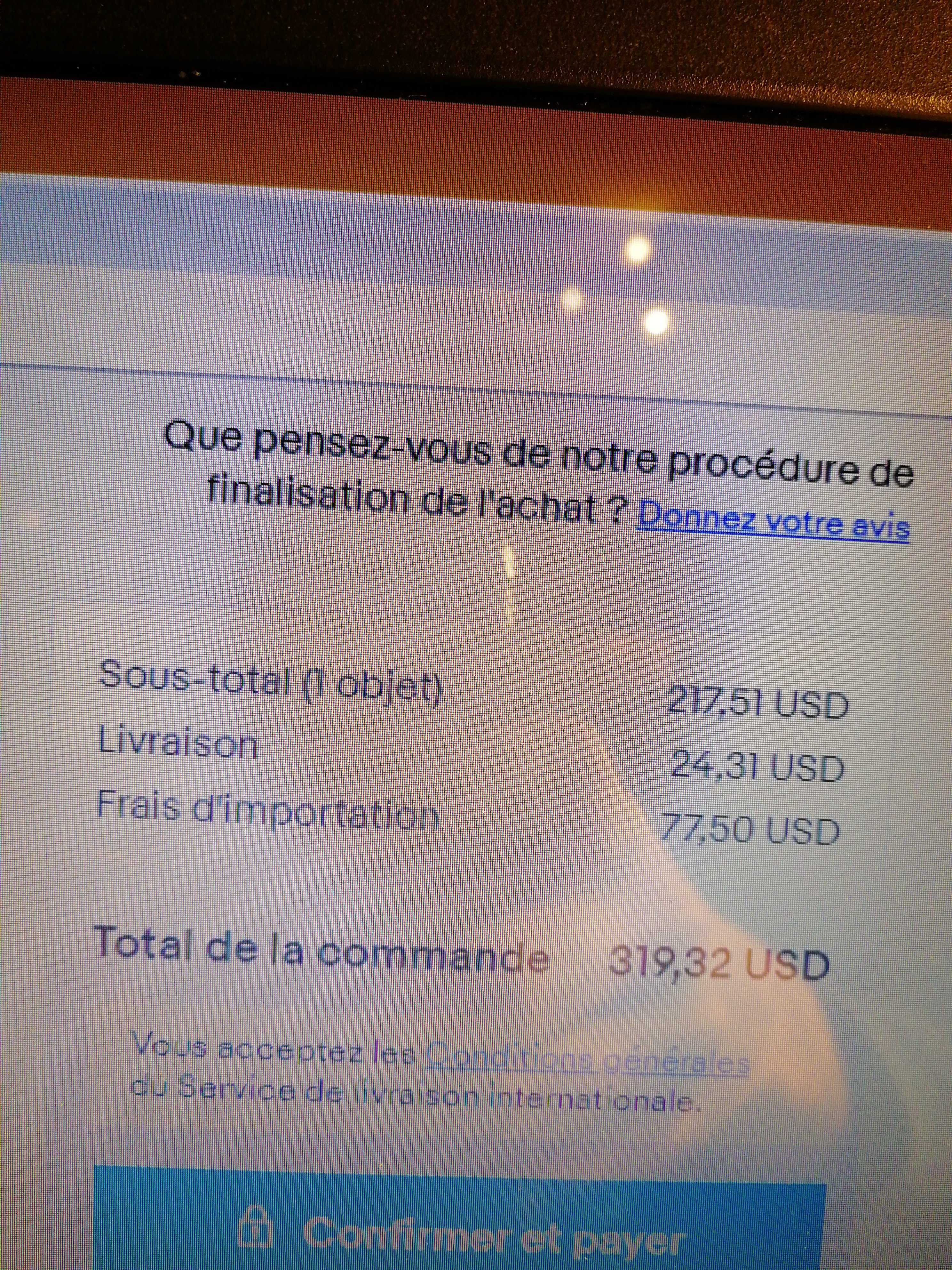 Félicitations pour ton achat, il faudra peux être que tu rajoute les frais de douanes, TVA et frais de dossier de la poste. N'oublie pas, environ 30% du prix de vente. Sauf si tu t arrange avec le vendeur....