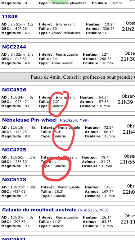 Donc toutes les galaxies que tu as listées sont nettement plus étendues, en théorie... En effet la taille indiquée est celle de la galaxie dans son ensemble donc avec les bras spiraux mais en général tu ne verras pas les bras spiraux dans l'oculaire et tu ne verras que le bulbe central qui est lui beaucoup plus petit.