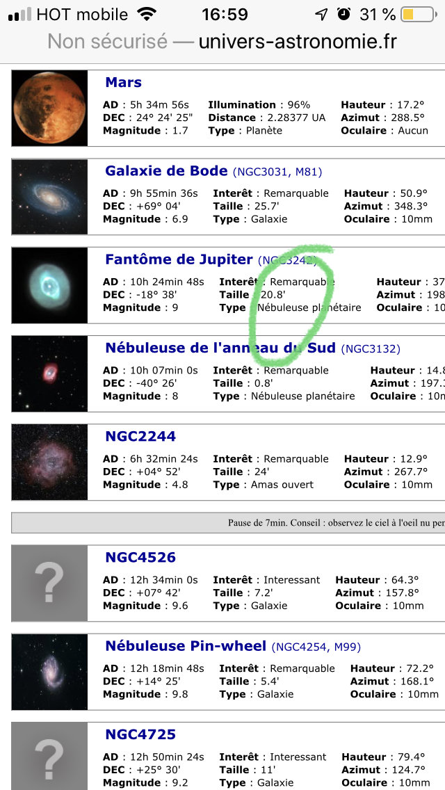 (ps Comment se fait-il que j’ai réussi à mieux voir M 57 qui est de magnitude neuf que un 27 magnitude 8,1 et surtout beaucoup plus grand)