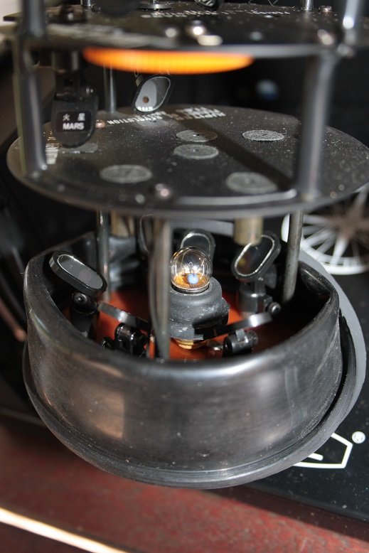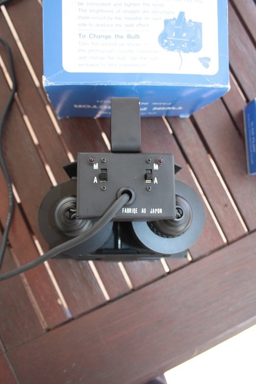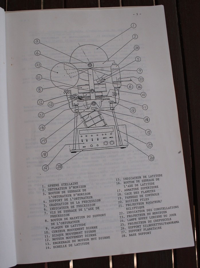 astroim Posté 23 juin 2019 Posté 23 juin 2019 (modifié) Bonjour Skywatcher707, et les autres, Oui, on peut bien dire inspiré d'un Goto E5. D'un autre côté une voiture celà a au moins trois roues, plus souvent quatre alors il n'y a pas quatre moyens de faire un planétarium (en dehors de ceux modernes à bas de PC et programmes). Allez, on continue la visite, le panneau de contrôle, on y retrouve tout ce qui permet de simuler "simplement" le jour, l'aube, le crépuscule, les mouvements en lent et rapide, d'allumer les planètes, le mériden, l'écliptique et l'équateur et les étoiles (les rhéostats règlent l'intensité lumineuse), On y trouve aussi les sorties pour le double projecteur et la "flèche lumineuse" (que je n'arrive pas à faire fonctionner, faut que je m'y penche un peu...), Les compartiments des piles (8 au total, modèle D); l'ancien proprio avait laissé quelques unes, ça a coulé il faudrait dans l'absolu remplacer un ou deux supports de piles, sinon en grattant un peu les contacts ça fonctionne, on le verra plus tard, Faisons un peu mieux connaissance avec "la mécanique", on voit ici non déployé, le système d'éclairage du jour (la "bougie"), en bas du cylindre, la fente qui simule l'aube (ou le crépuscule à l'opposé de la tête), et la plaque sur laquelle on insère une scène d'horizon, Disque des dates et cylindre de projection équateur-éclitique (en noir), le moteur de suivi diurne, Une autre vue, L'ensemble qui porte les mécanisme des planètes (on y trouve Mercure, Vénus, Mars, Jupiter et Saturne, ainsi que le Soleil et la Lune), Le cône du bas, (en caoutchouc), contient quand à lui l'éclairage des planètes et les miroirs de renvoi vers chacune d'entre elles, (à noter qu'on éclaire tout l'ensemble ou rien / ne pas tenir compte de l'étiquette "Mars", petite erreur des japonais ... les autres miroirs n'ont pas d'étiquettes eux), Gros plan sur les miroirs Jupiter et Saturne, chargées eux de projeter sur le dôme le faisceau lumineux (petit disque), l'on peut modifier l'inclinaison de ces miroirs pour par exemple positionner l'image de la planète sur le dôme, au N ou au S de l'écliptique), Gros plan sur l'ensemble mécanisme, on notera que chaque planète possède un filtre coloré dans le chemin optique, histoire de les reconnaitre, mais déjà à leur vitesse de passage on les reconnait !, Ici, le disque permettant les phases de la Lune, à tourner manuellement, Enfin, voici la sphère des étoiles; les petits disque blanc simulent eux la Voie Lactée , enfin du moins la trace de la Voie Lactée dans le ciel, c'est "très" discret, Ne reste plus qu'à assembler le dôme, L'habiller de sa bâche, le poser et verrouiler sur l'appareil l'ensemble et voilà !, La "boite de camembert" est le système de projection du méridien, Dans l'épisode suivant quelques images de la projection. Franck Modifié 23 juin 2019 par astroim