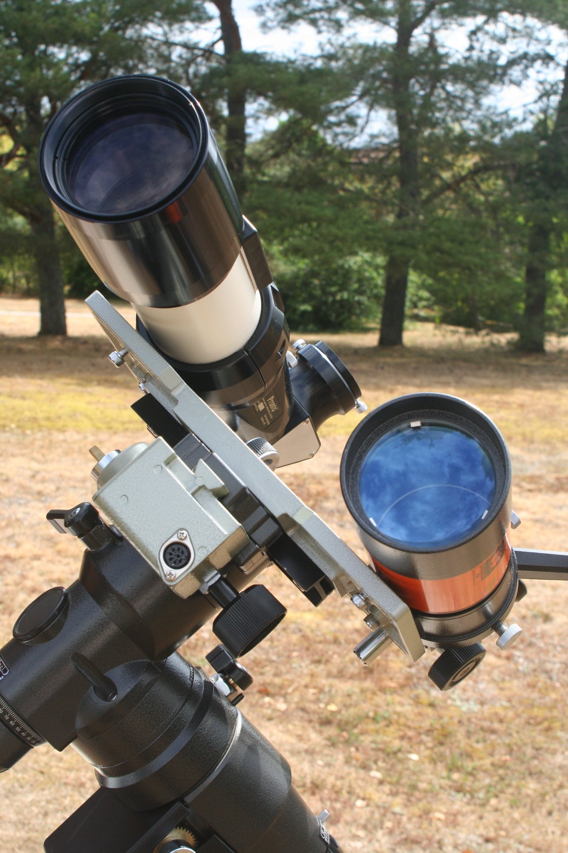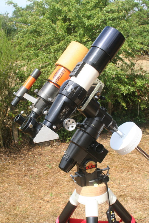 Skywatcher707 Posté 30 juillet 2019 Posté 30 juillet 2019 Salut les amis du club Vintage ! Alors voilà, j'ai profité des congés pour tester un peu la Perl Halley 70 qui me sert habituellement de chercheur sur un SC Celestron (orange bien sûr !). Et je l'ai montée en // avec ma (plus récente mais pas toute jeune non plus...) TVO Pronto (doublet ED 70/480). Qq photos dessous. Observations faites hier soir 29/7 avec un très beau ciel, très bonne transparence, turbu nulle, pas d'humidité (contrairement à la veille). Pas de Lune visible... 2 renvois coudés à miroir. Et tout mon fatras d'oculaires anciens (Celestron Ultima, Plossl de différentes marques en 31,75 mm) ou plus récents (gammes TVO), mais en laissant les 24,5 mm de côté ; je voulais vraiment voir jsq'où pousser le grossissement. Les 2 lunettes sont parfaitement collimatées. Déjà le zoom TVO 8-24 en alternance sur les 2 tubes optiques. Sur Jupiter... Les images sont petites, très petites quand on est habitué à d'autres instruments... Un peu plus gros. La qualité est au rendez-vous, l'image un peu plus petite dans la Halley 70 (400 de focale vs 480 pour la Pronto et ca compte) ; on voit de suite que la tâche rouge (orange) est présente, un satellite va disparaître. Le chromatisme est présent des 2 côtés, mais pas gênant. L'image est plus colorée toutefois dans la Pronto. Je change le zoom 8-24 pour passer au zoom 3-6 TVO. Dans les 2 cas, il est possible d'aller jsq'à 4 mm de focale (100x avec la Halley et 120x avec la Pronto) sans problème avec une belle image, les bandes bien visibles, détaillées, contrastées, la GTR aussi. Je pousse à 3 mm (133x pour la Halley et 160x pour la Pronto) : la MAP est très difficile avec la Halley, l'image "pâteuse", on distingue uniquement la bande principale et la GTR ; dans la Pronto, malgré une baisse de luminosité, la MAP est accessible, l'image reste correcte avec la présence de la bande au niveau de la GTR. Pour confirmer je recommence le même exercice avec les oculaires TVO Radian 4 et 3 mm (un peu plus anciens que le zoom 3-6) : les résultats sont identiques. Même déroulement sur Saturne. Alors que je m'attendais à un résultat identique, l'image reste belle jsq'à la focale 3 mm, Cassini bien visible, image colorée, bande large avec changement de teinte, l'image est toutefois un peu plus intéressante à observer dans la Pronto, mais de peu supérieure. Peut-être que le résultat précédent est du au fait que Saturne était au méridien et que Jupiter déclinait déjà. On savait déjà qu'elle était bonne cette Perl Halley 70 alors si vous en trouvez une (pas trop chère toutefois)... Bonnes observations ! 1 4