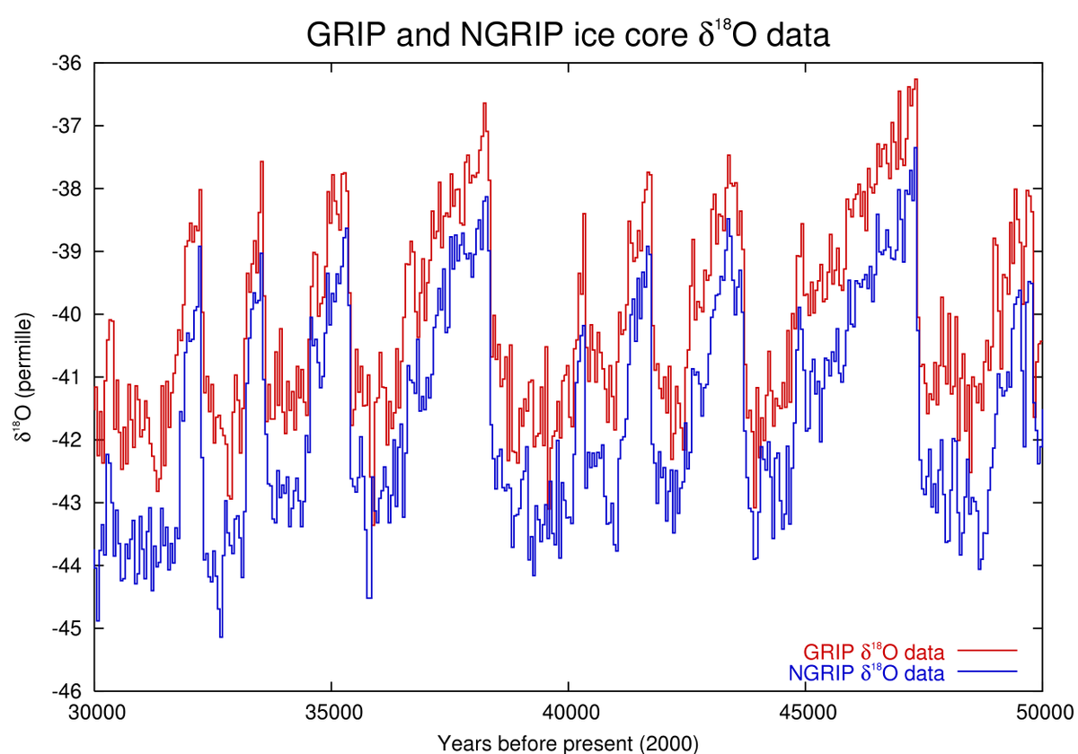 Dès le début des années 2000, les glaces groenlandaises livrent un enregistrement à ce niveau de détail (ci-dessous) qui montre du reste des amplitudes thermiques brutales identifiées sous le nom d'événements de Dansgaard-Oeschger . Ces amplitudes expliquées depuis par un phénomène océanographique local sont restreintes à l'Atlantique Nord, à la différence du réchauffement global actuel.