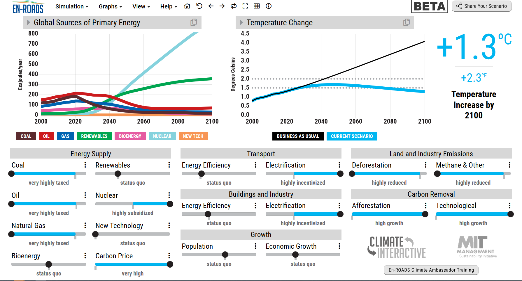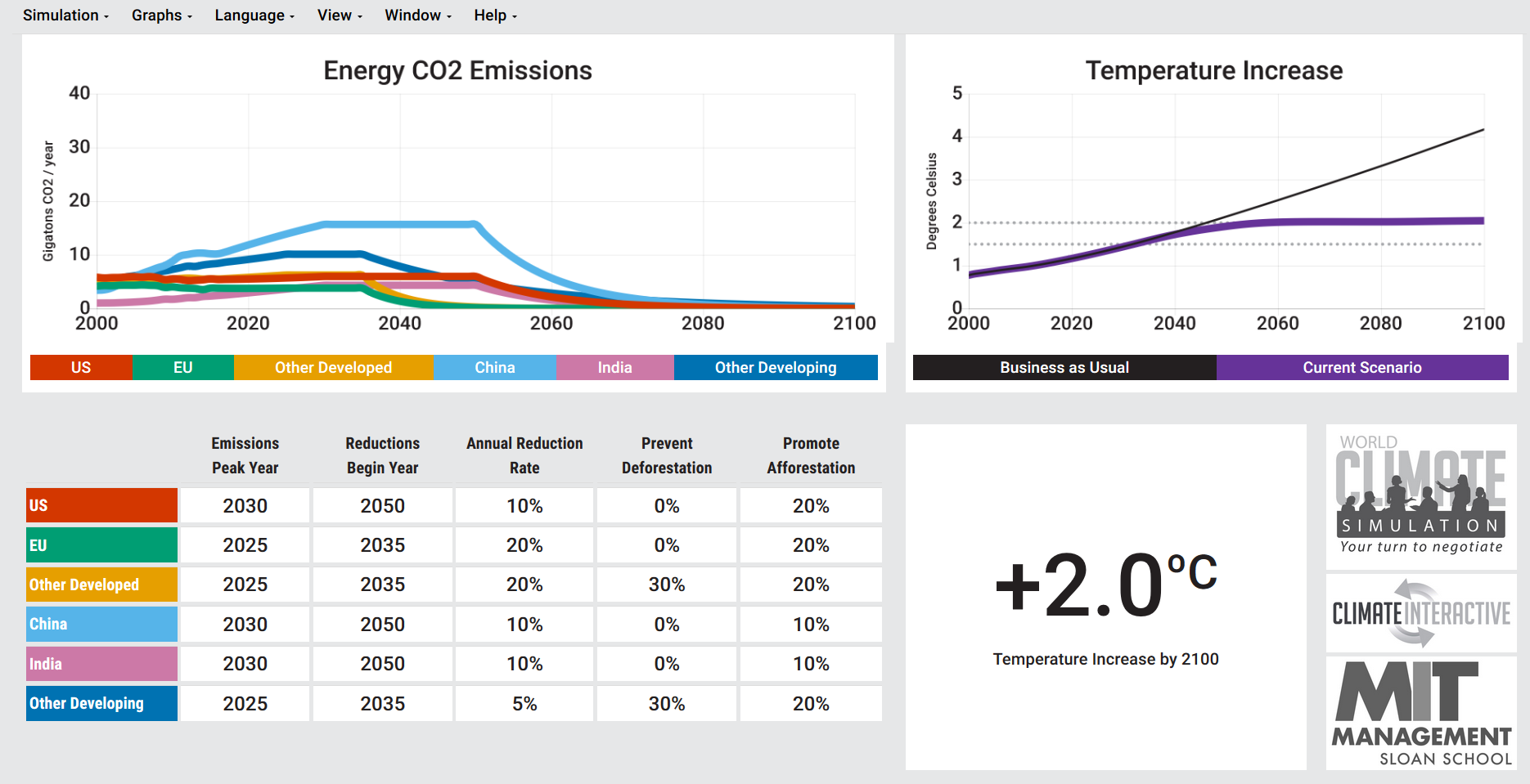 Pour s'amuser ou pas, un (des) simulateur (s)  on line élaboré, entre autre par le MIT, permet de calculer les effets de telles ou telles mesures : https://www.climateinteractive.org/tools/