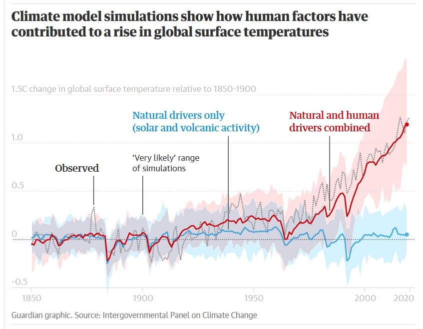 Le rapport du GIEC vient d'être publié, il indique que les 1.5°C de réchauffement par rapport aux niveaux préindustriels seront dépassés au cours des deux décennies qui viennent. On est donc certain d'être au-delà des Accords de Paris. Les effets sont maintenant "inévitables et irréversibles", parmi lesquels la hausse du niveau marin, la fonte de la banquise arctique, et le réchauffement/acidification des océans, et évidemment les événements climatiques extrêmes comme ceux que nous vivons cet été.