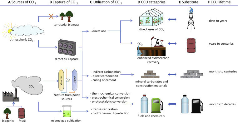 Schéma listant les sources de CO2 (A), capture de CO2 (B), et des exemples d'utilisation (C) classant les méthodes en quatre catégories (D), chacune avec le produit remplacé dans l'économie conventionnelle (E) la durée de vie (F). La capture directe du CO2 par la biomasse, très efficace (croquis en haut à gauche) n'est pas rangée dans ces méthodes par cet article