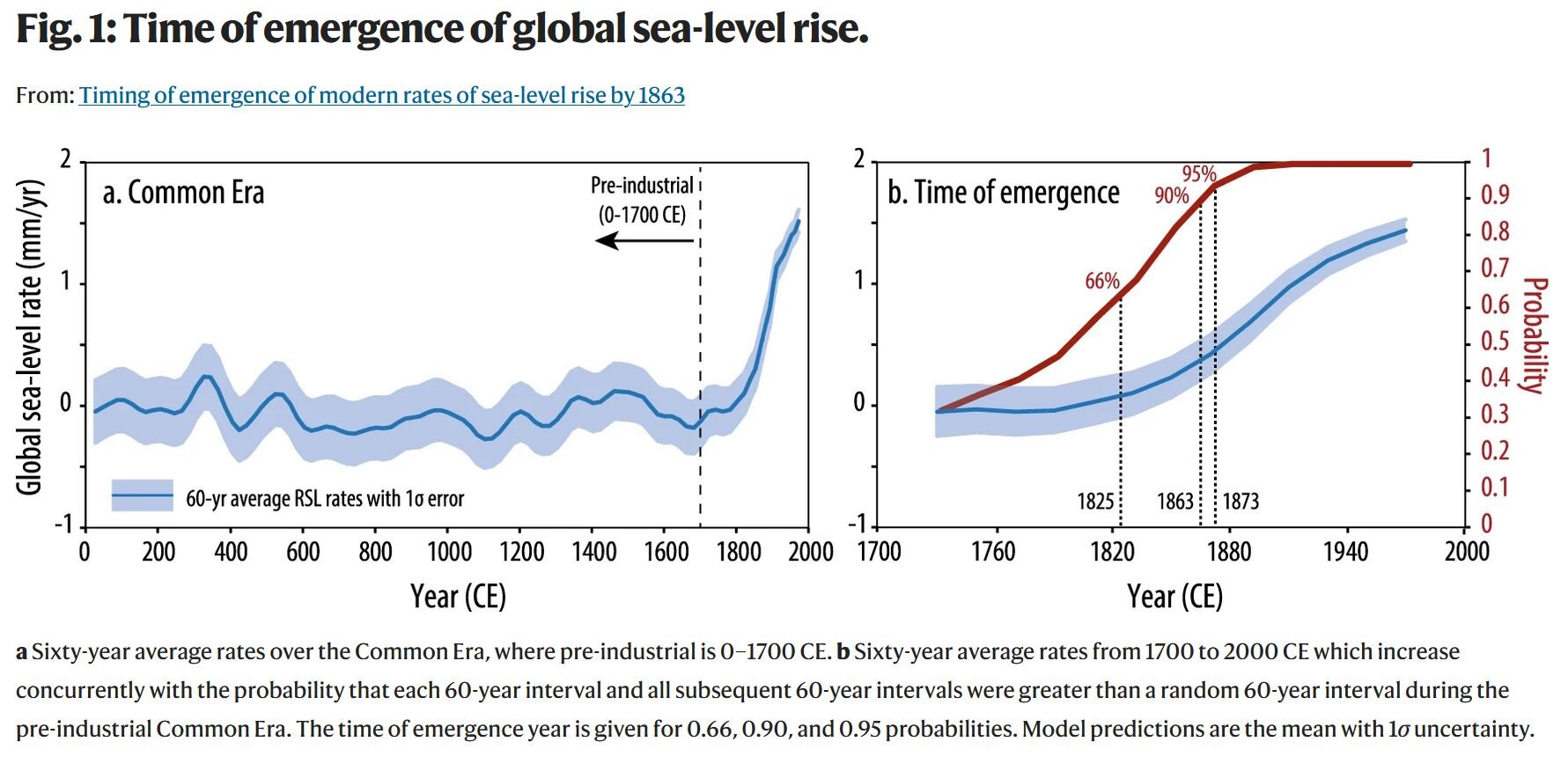 Etonnant ce constat! la seconde révolution industrielle avec recours massif au charbon (acier / machine a vapeur etc...) et les émissions massives qui vont de paire et augmentation progressive du CO2athmo commence véritablement vers 1870... donc après le point d'inflexion de la montée des eaux!