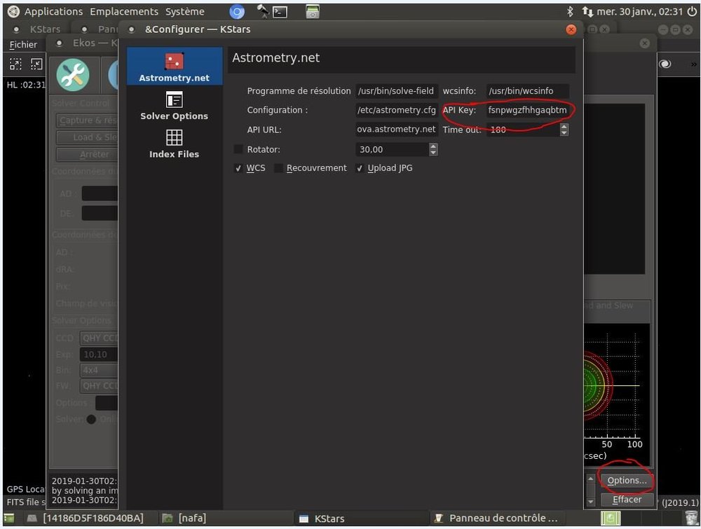 supaii Posté 8 août 2019 Posté 8 août 2019 une precision pour calculer ton champ ou du moins le determiner. Fait une resolution astrometrique avec "online" de cocher. L'upload et le calcul de ton image se fera sur les servers nova.astrometry. Je te conse il de céer un compte sur http://nova.astrometry.net/ afin d'avoir ta propre "API key" et de changer la clé dans ekos (bouton option dans l'onglet astrometry) example chez moi