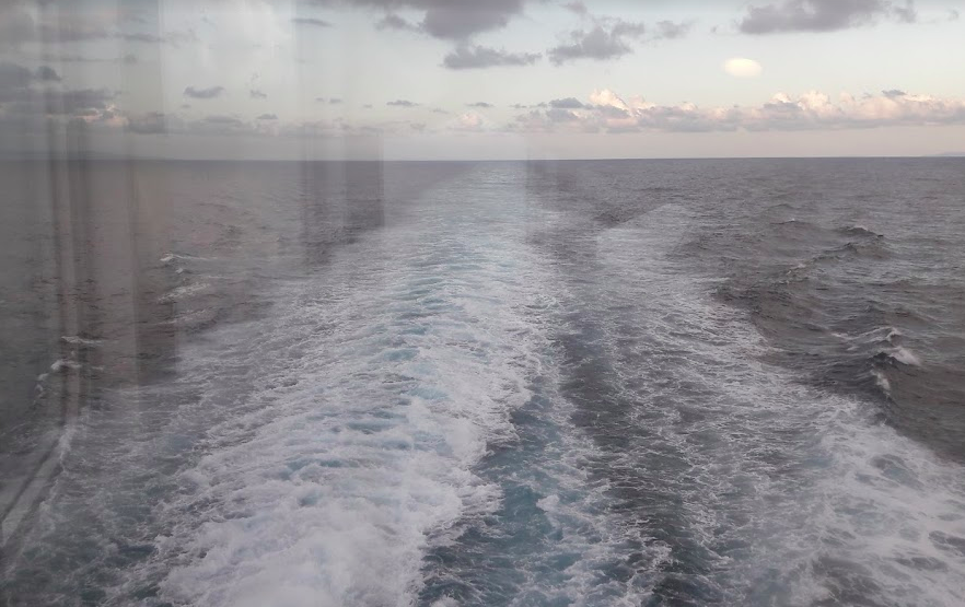 Ce phénomène est également très bien mis en évidence quand, à bord d'un navire, on observe son sillage à l'arrière. Ses deux bords, droit et gauche, pourtant parallèles, devraient mathématiquement être vus convergents en un point de l'horizon si celui-ci était à l'infini (cas d'une Terre plate). Hors ce n'est pas le cas, et il subsiste un écart entre les deux traces au niveau de l'horizon visuel. C'est donc bien que la Terre est une boule.