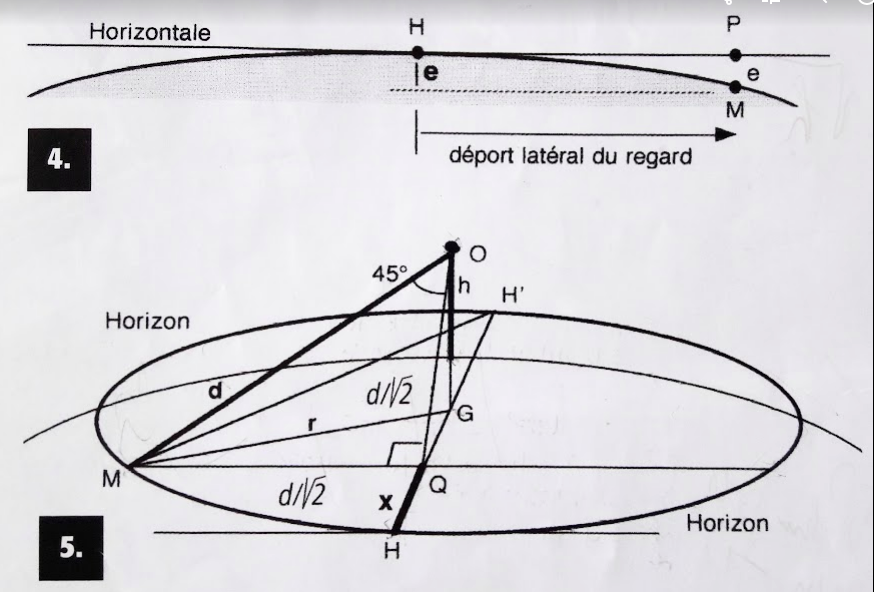 Charpy, oui on voit toujours à la même distance, celle de l'horizon, tout autour de soi mais il n'empêche que, quand on regarde droit devant soi, tout en embrassant un champ large, par exemple de 60 à 90°, la partie centrale du champ est légèrement plus haute que les extrêmes. Si tu as réfléchi à l'exemple que j'ai donné et compris la similitude avec un cerceau posé au sol, alors tu auras fait un grand pas.