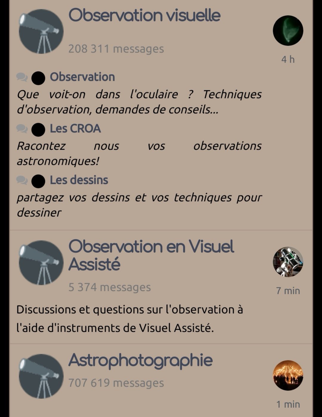 C’est à peu près la séparation qui existe déjà sur WA (il y a une section dédiée au matériel VA, une autre pour les observations comme tu l’as noté, il y a eu le club VA sur lequel on postait des tutos malheureusement disparus depuis. Il manquerait juste la section « que des images » si j’ai bien compris).