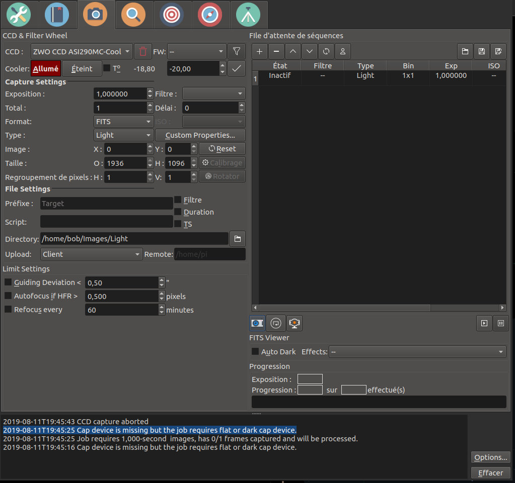 gosseyn Posté 12 août 2019 Auteur Posté 12 août 2019 (modifié) Bonsoir Je précise que le souci est identique avec un profil simulateurs. Sur le profil normal lors de capture de dark, flat ou offset le message est ; 2019-08-12T19:52:32 Cap device is missing but the job requires flat or dark cap device. puis 2019-08-12T19:52:15 CCD capture aborted. Lors des capture de Light seul le premier message apparaît Merci Modifié 12 août 2019 par gosseyn