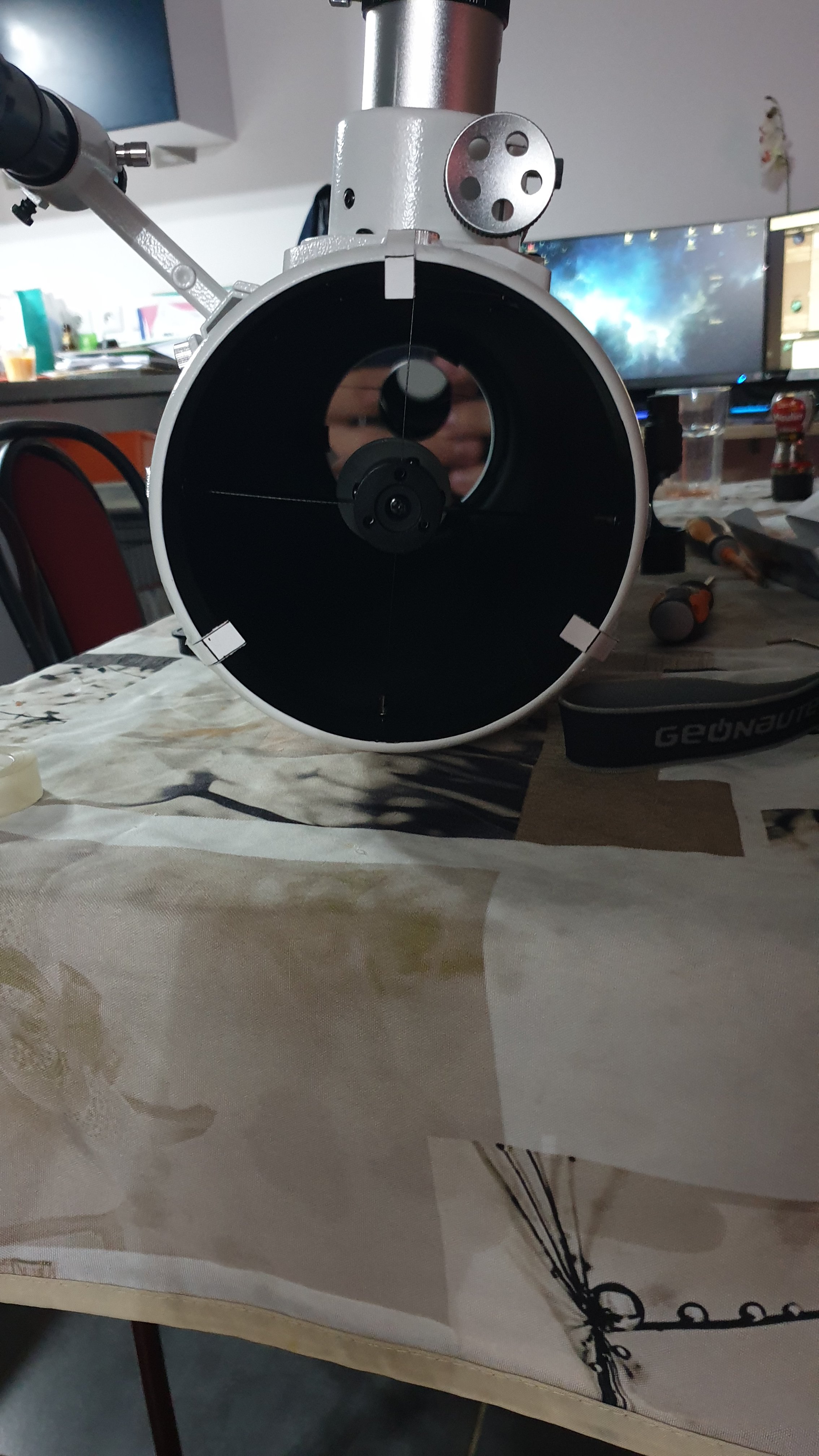 3- ensuite je positionne le secondaire en 2 temps, d'abord en bouchant le primaire (pas forcémment nécessaire mais c'est facile à faire avec un dobson Treillis) [première photo]