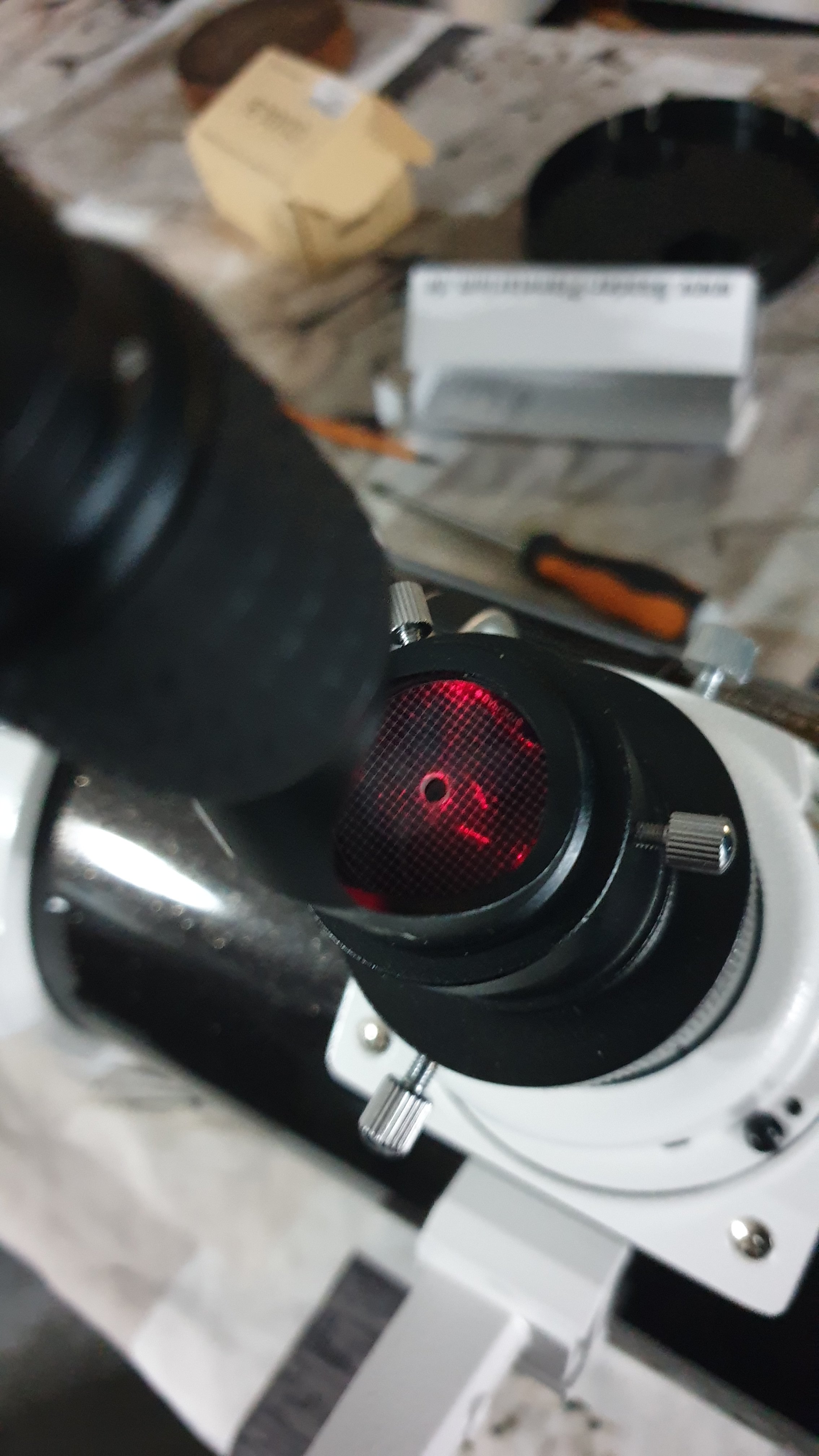 Là tu utilise le laser pour orienter le secondaire correctement en rotation : tu dévisse à peine la vis centrale et tu tourne le support du secondaire jusqu'à ce que le sport soit au plus près de la marque du primaire dans la direction du porte oculaire.