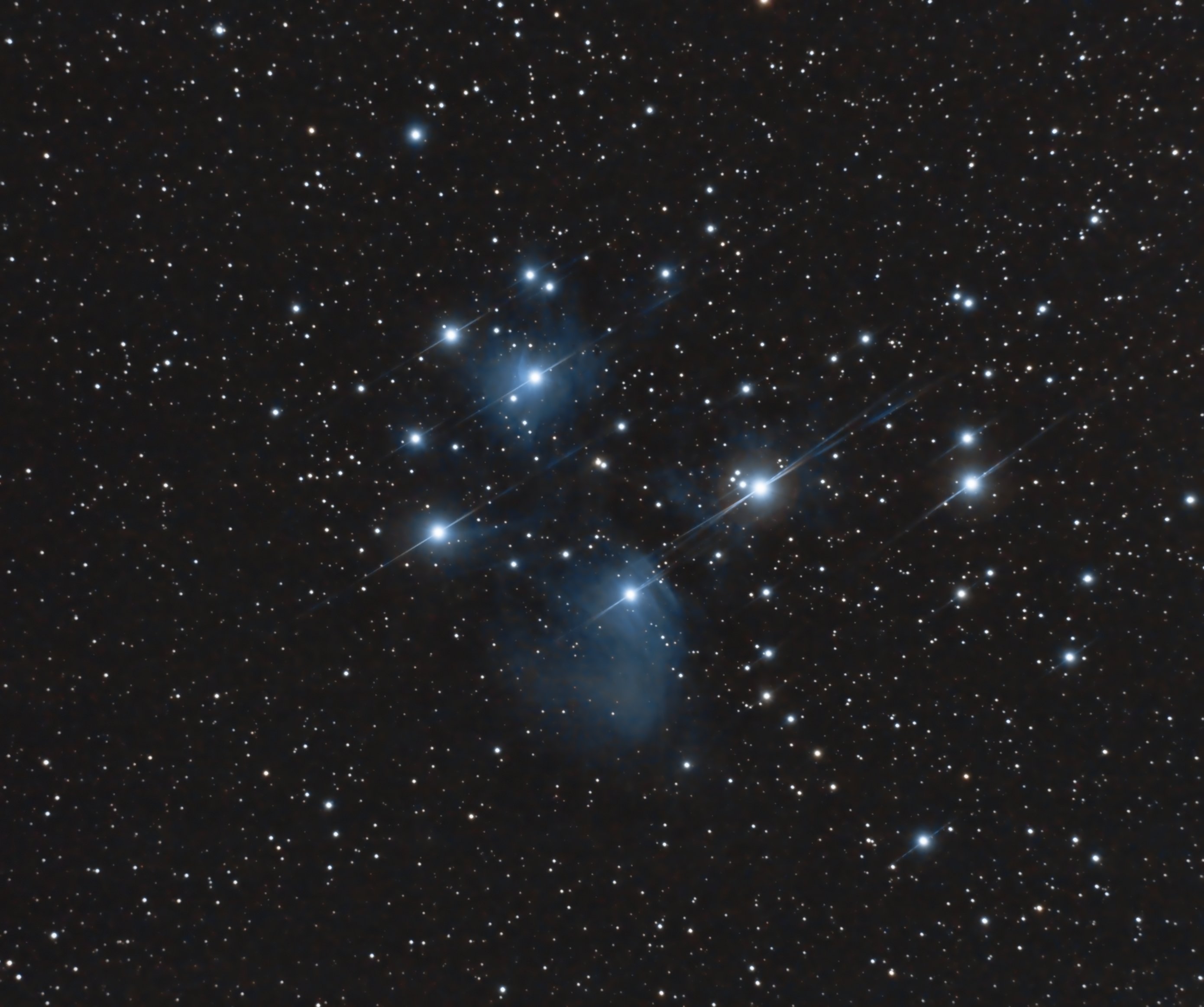 Sympa ces petites pleiades,elles sont gourmandes en pose si on veut bien faire ressortir les nuages de poussière.Pour le reflet sur les grosses étoiles effectivement c'est bizarre normalement avec une lulu tu devrais pas avoir d'aigrettes.