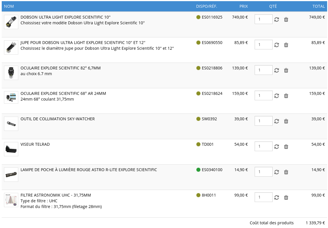 Voila le final chez Pierro Astro: tout ES pour les oculaires et filtre astronomik en 1,25 finalement pour l'instant (j'ai le temps avant de passer en 2'' et ça se revend bien si besoin apparemment...).