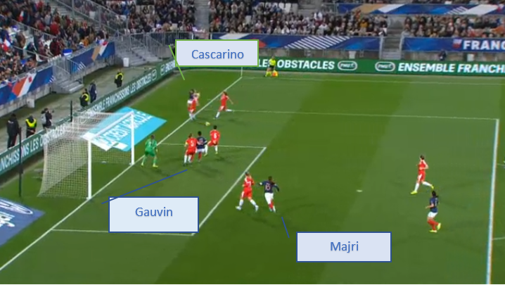 Valérie Gauvin attend souvent au second poteau sur ces attaques venant de la gauche mais en vain, le Sommer préférant tirer au but directement.