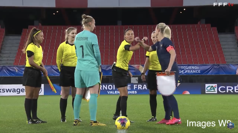 un préparateur physique de l'équipe de France sur le bord du terrain a pris un carton jaune par l'arbitre danoise.