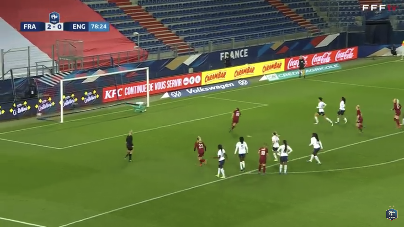 Coup franc du coup et Renard a bien failli mettre en doublé mais la gardienne a réussi là encore un super arrêt en surgissant pour boxer le ballon.