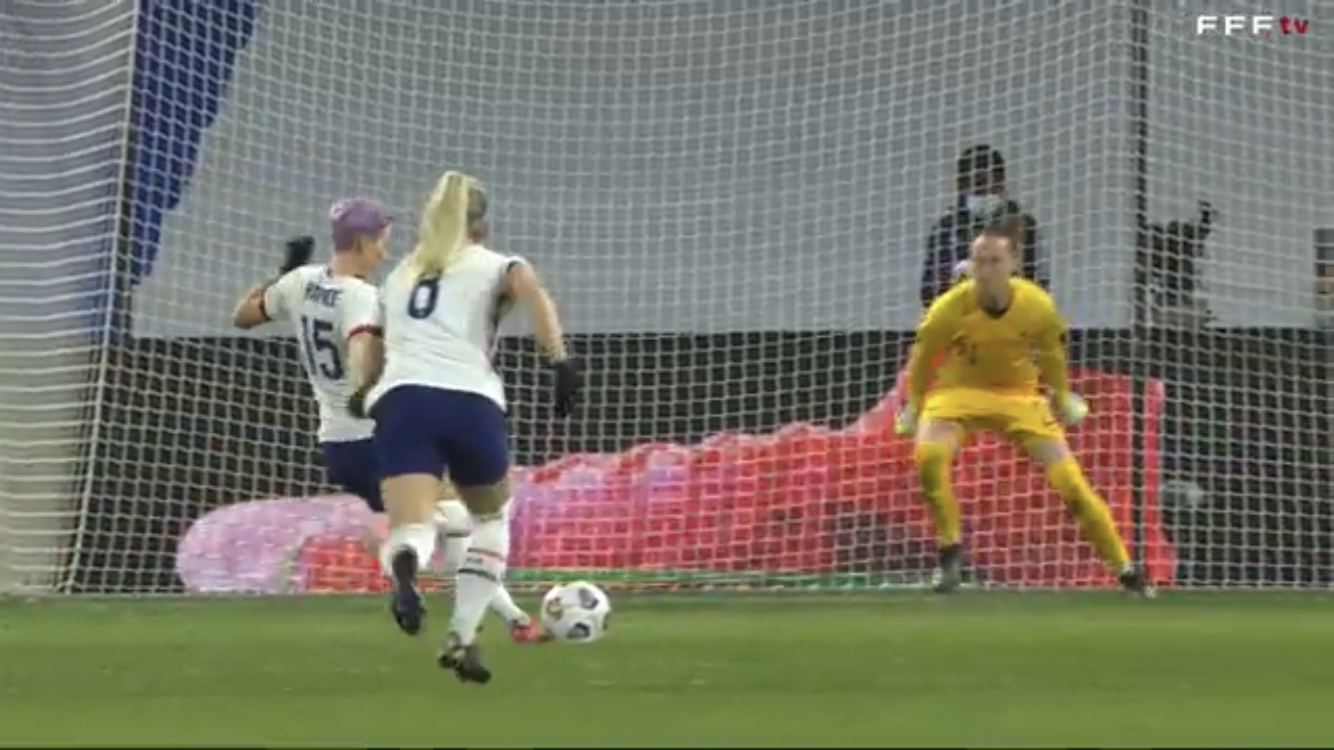 On joue la 30ème et Rapinoe se prend un ballon dans la tête (dans la surface)