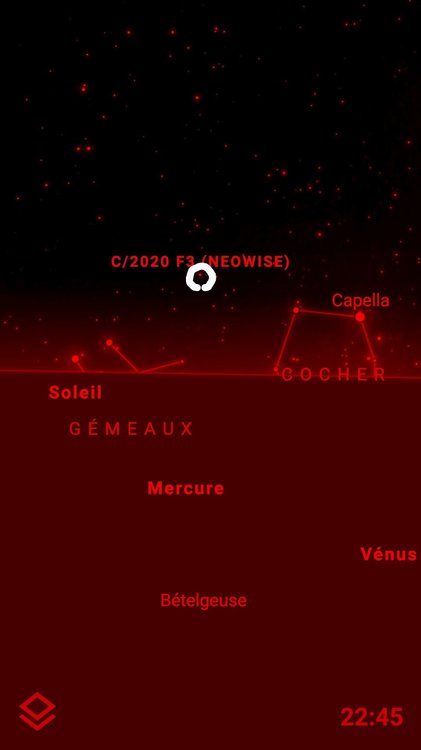 Avant que les puristes du forum ne m'envoient au bûcher, je rappelle quand même que l'utilisation du smartphone est déconseillée pendant l'observation, car la lumière envoyée par l'écran empêche l’œil de passer en mode vision nocturne. Le mode "lumière rouge" de Stellarium atténue un peu cet effet éblouissant, mais ça reste à bannir si tu veux être dans des conditions optimales pour observer.
