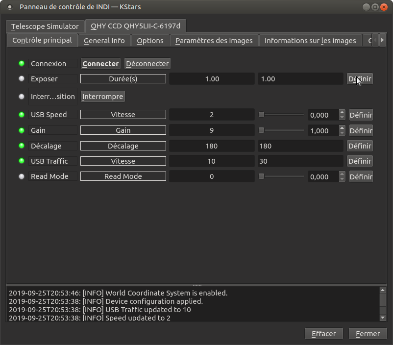 dragonlost Posté 26 septembre 2019 Posté 26 septembre 2019 Il y a 7 heures, Patrick B a dit : Voila, j'ai appliqué une pose de 2s, j'ai défini, et j'ai le résultat dans l'image jointe. le décompte fonctionne, apparemment la photo est prise, mais ça s'arrête là, rien ne s'affiche Ok il y a effectivement un problème kstars et la qhy. Je vient de tester avec ma qhy5l-iic et la prise de vue marche mais le mode vidéo fait planter la caméra. Je vais voir sur le forum indi si je trouve des pistes. Tu as quoi comme version de indi ? ( indiserver -h dans un terminal )