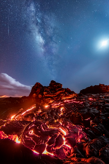 Cette photo a été prise par Mike Mezeul , un photographe américain qui était parti à Hawaï pour faire un reportage sur la coulée de lave « 61G » du volcan Kilauea. Elle montre la coulée de lave, la Voie Lactée, la Lune et un flash Iridium.