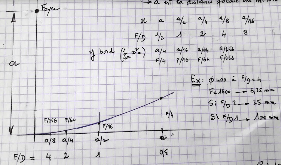 Pour info, voici l'allure de la parabole de focale F, pour différentes ouvertures F/D (en bas) :