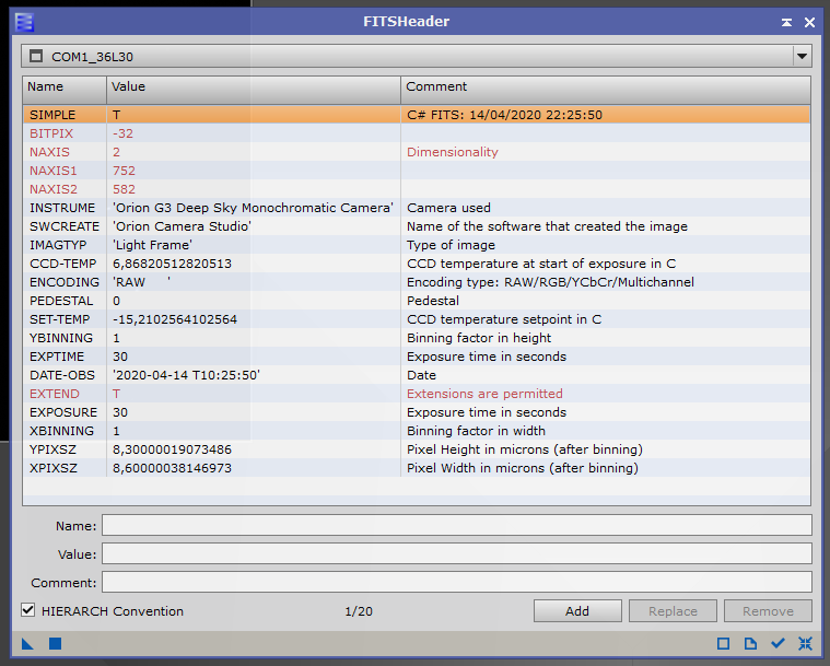 lock042 Posté 21 avril 2020 Auteur Posté 21 avril 2020 il y a 3 minutes, Cissou8 a dit : @lock042,Juste pour comprendre un truc qui m'a surprise, les fichiers en 32 bit ne sont pas strictement entre 0. et 1. (je les ai pas clippé dans le doute). Oui, les débordements sont possibles (valeurs négatives et valeurs supérieures à 1) histoire de gérer plein de situations (notamment empecher de clipper à 0 lors du prétraitement, chose que les gens n'aiment pas en photométrie). il y a 4 minutes, Cissou8 a dit : Un autre truc, y a un signe '-' dans la clé BITPIX qd on est en 32bit, ca sert à quoi? Ca c'est la valeur défini par les standards de cfitsio: https://heasarc.gsfc.nasa.gov/docs/software/fitsio/c/c_user/node20.html il y a 5 minutes, Cissou8 a dit : Et dernier truc, la commande seqsplit_cfa est pas listée dans l'aide sur https://free-astro.org/index.php/Siril:Commands Ah, je vais me faire engueuler par @vinvin alors. Je vais la rajouter. 1