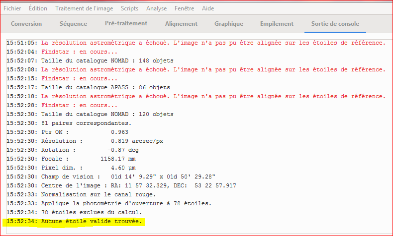 lock042 Posté 25 mars 2020 Auteur Posté 25 mars 2020 (modifié) Et bien c'est que tu n'as aucune étoile valide pour l'étalonnage des couleurs. Il exclut 78 étoiles comme tu peux le voir, ce qui doit correspondre à toutes tes étoiles. Peut être sont elles saturées. Modifié 25 mars 2020 par lock042