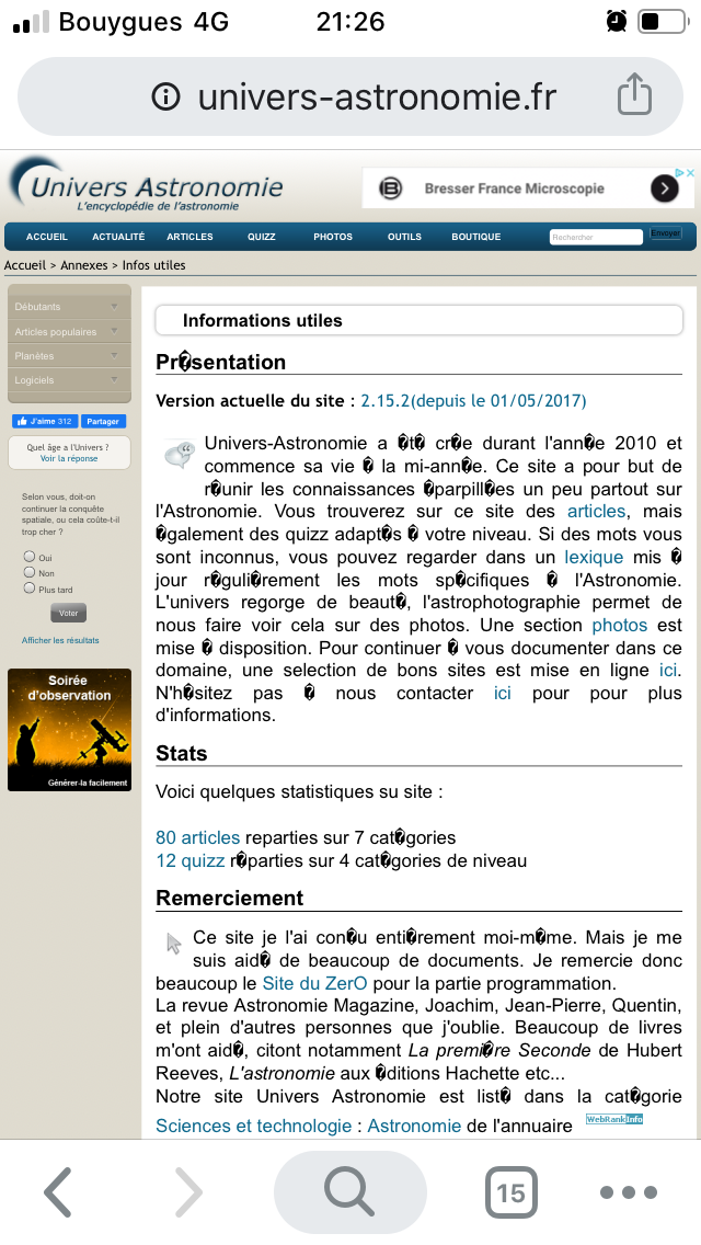 Bonjour à tous. Est-ce que quelqu’un se sert du générateur de soirée de univers astronomie parce qu’il ne fonctionne plus de mon téléphone. Il y a des points d interrogation partout. Ou si quelqu’un a un autre site à me proposer. Merci
