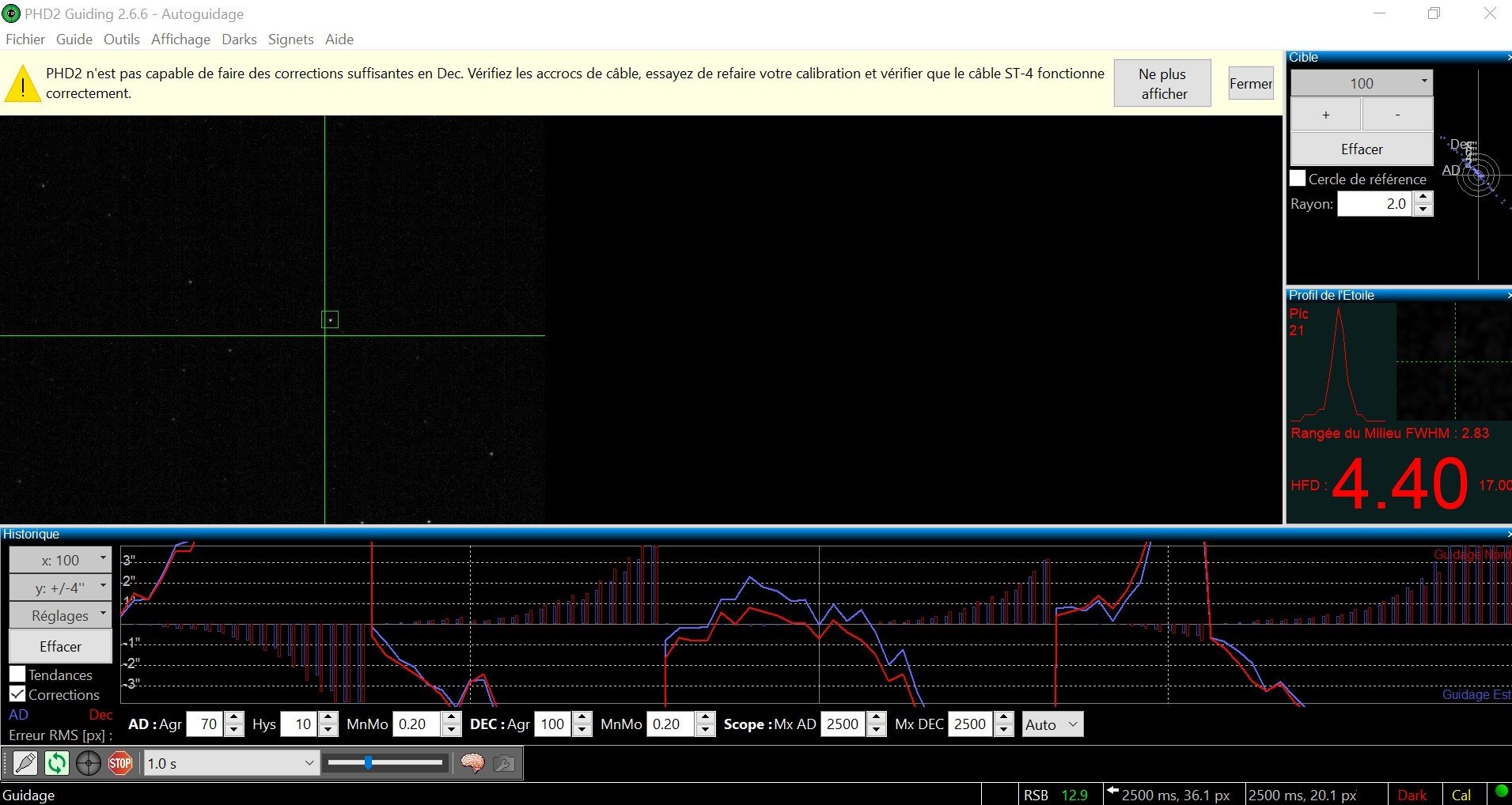 Après avoir mis du temps à monter tout le matériels, dehors, pas 0 degrés, je vise les pléiades, tout est prêt, je vais sur mon PC, je calibre et le guidage se lance, et après 3 seconde les courbes de l'historique s'en vont, et l'étoile guide décide de partir elle aussi..d'ailleurs, il me précise bien "étoile perdu" <_<